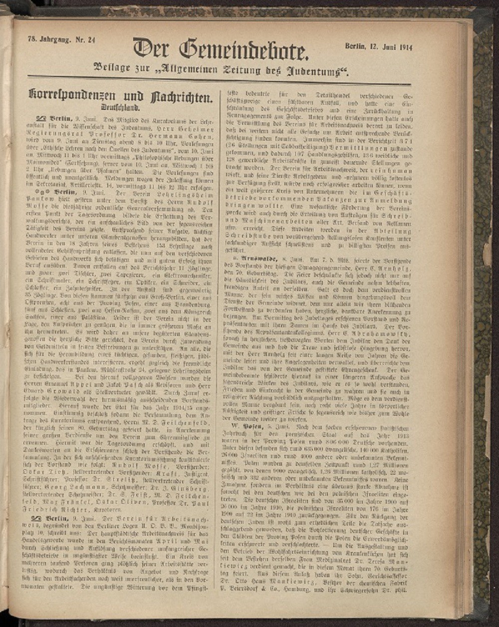 Der Gemeindebote-Beilage der Allgemeinen Zeitung des Judentums 12. Juni 1914