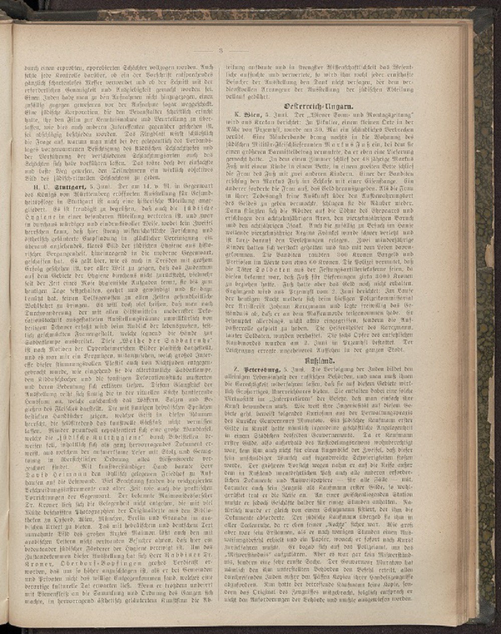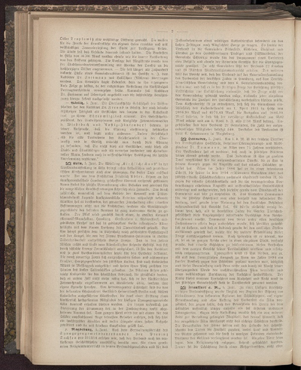 Er wurde nach mehrstündiger Verhandlung zu drei Monaten Gefängnis verurteilt. – In Birnbaum wurde eine Volksbadeanstalt eingeweiht und eröffnet, die mit einem Kostenaufwand von 65 000 Mark errichtet und von Herrn Oscar Tietz in Berlin, dem Ehrenbürger der Stadt Birnbaum, anläßlich seiner silbernen Hochzeit gestiftet worden ist. – Die seit 1899 bestehende und etwa 700 Seelen umfassende Synagogengemeinde Köln-Ehrenfeld ist mit Genehmigung des Regierungspräsidenten der Gemeinde Köln einverleibt worden. – Am 24. d.M. fand in Münster unter reger Beteiligung die ordentliche Generalversammlung des Vereins zur Wahrung der religiösen Interessen des Judentums in Westfalen statt. Dr. Rubens ( Gelsenkirchen) gab den Vorstandsbericht, der eine Erweiterung der bisherigen Arbeit auf religiösem und kulturellem Gebiet nachwies. Nach Erledigung verschiedener innerer Vereinsangelegenheiten hielt Rechtsanwalt Dr. J. Kahn( Köln) einen Vortrag über die Aufgaben und die Zukunft der Landgemeinden Westfalens, in dem er insbesondere vor der Landflucht und dem Zuge nach der Großstadt warnte. – Dem Geheimen Sanitätsrat Dr. Jaffe und dem Sanitätsrat Dr. Günzberg in Frankfurt a. M. ist der Rote Adlerorden vierter Klasse verliehen worden. – In Wien ist vor kurzem Herr Markus Weißmann Chajes, ein hervorragender jüdischer Gelehrter, in hohem Greisenalter verschieden. Von seinen Schriften erwähnen wir besonders seine Glossen zum Jeruschalmi ( Krotoschin 1866) und Dibre Chachamim ( Wien 1892). – Im Jahre 1912 zählte man in Ungarn 561 Muttergemeinden und 1789 Filialen, und zwar: orthodoxe 319 Haupt- und 1315 Filialgemeinden, Kongreß 182 Haupt- und 338 Filialgemeinden, Statusquo 60 Haupt- und 136 Filialgemeinden. Gegen 1911 hat die Orthodoxie 2 Hauptgemeinden mehr und 9 Filialgemeinden weniger, die Kongreßorganisation 4 Filialgemeinden weniger. Diese Statistik läßt keinen Schluß auf die Seelenzahl zu. So zählt die Pester Kongreßgemeinde allein an 180 000 jüdische Seelen, also nahezu den fünften Teil aller Juden Ungarns. In Kroatien gibt es 27 Gemeinden. – Aus Paris wird gemeldet: Madame Emilie Deutsch de la Meurthe, eine wegen ihres Wohltätigkeitssinnes hochangesehene Dame, hat dem Präsidium der jüdischen Gemeinde 100 000 Francs für die Wohltätigkeitseinrichtungen derselben gespendet. – Als ein interessanter Beweis für die leichte Assimilationsfähigkeit der Juden mag die Meldung aus London dienen, wonach unter den im Jahre 1913 in England naturalisierten 1700 Ausländern sich 600 russische Juden befanden. Aber auch unter den als Oesterreicher, Ungarn, Deutsche und Türken verzeichneten neuen englischen Staatsbürgern gibt es sehr viele Juden, so daß Eingeweihte behaupten, daß im Jahre 1913 zumindest zwei Drittel der Naturalisierten Juden waren. Das ist umso bedeutsamer, als ja bekannt ist, daß gerade in England die Bedingungen, an welche die Naturalisation geknüpft ist, sehr streng sind, und daß die Aufnahme eines Ausländers in den englischen Staatsverband von der Ablegung einer schweren Prüfung in englischer Sprache abhängig ist. – Durch große Feuersbrünste sind mehr als tausend jüdische Familien im Gouvernement Kowno brot- und obdachlos geworden. Fast in einen Trümmerhaufen verwandelt ist die Kreisstadt Keidavy, die eine jüdische Bevölkerung von etwa 10 000 Seelen zählt. Das gleiche Schicksal teilten die Städte Boboria, Skala, Dißna, Kopust und viele andre kleine Städtchen. Die Not ist dort unbeschreiblich. Schleunigste Hilfe tut not. – Anläßlich der jüngsten Graduierung der Absolventen der jüdischen landwirtschaftlichen Hochschule Woodbyne im Staate New-York sind der Institutsleitung so viele Gesuche von Gutsherren um Zuweisung von Absolventen der Anstalt zugekommen, daß viele dieser Ansuchen unberücksichtigt bleiben mußten. Die betreffenden Farmbesitzer erklärten in ihrer Zuschrift, daß die jüdischen Farmer und Agronomen allen anderen bevorzugt werden, und ganz besonders sind es die Absolventen der Baron Hirschschen landwirtschaftlichen Hochschule von Woodbyne, welche gesucht werden. Das Kuratorium der Anstalt hat nun eine Erweiterung derselben beschlossen, und mit dem beginnenden Schuljahre wird die Zahl der aufzunehmenden Schüler verdoppelt werden. Woodbyne ist bekanntlich die einzige ausschließlich jüdische Stadt in Amerika, in welcher sämtliche öffentlichen Stellen, vom Bürgermeister bis zum letzten Straßenkehrer, von Juden besetzt sind.