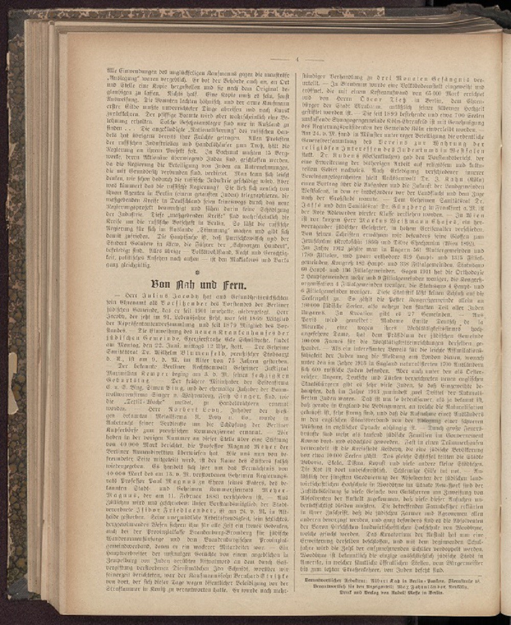 Herr Julius Jacoby hat aus Gesundheitsrücksichten sein Ehrenamt als Vorsitzender des Vorstandes der Berliner jüdischen Gemeinde, das er seit 1901 innehatte, niedergelegt. Herr Jacoby, der jetzt im 91. Lebensjahre steht, war seit 1869 Mitglied der Repräsentantenversammlung und seit 1879 Mitglied des Vorstandes. – Die Einweihung des neuen Krankenhauses der jüdischen Gemeinde, Exerzierstraße Ecke Schulstraße, findet am Montag, den 22. Juni, mittags 12 Uhr , statt.-- Der Geheime Sanitätsrat Dr. Wilhelm Blumenfeld, preußischer Stabsarzt d. R., ist am 9. d. M. im Alter von 75 Jahren gestorben.-- Der bekannte Berliner Rechtsanwalt Geheimer Justizrat Maximilian Kemper beging am 3. d. M. seinen sechzigsten Geburtstag. – Der frühere Mitinhaber der Seidenfirma E. und S. Bing, Simon Bing, und der ehemalige Inhaber der Baumwollwarenfirma Singer und Wahrenberg, Fritz Singer, sind, wie die „Textilwoche“ meldet, zu Handelsrichtern ernannt worden. – Herr Robert Levy, Inhaber der hiesigen bekannten Metallfirma N. Levy und Co., wurde in Anbetracht seiner Verdienste um die Schöpfung der Berliner Kupferbörse zum preußischen Kommerzienrat ernannt. – Wir haben in der vorigen Nummer an dieser Stelle über eine Stiftung von 40 000 Mark berichtet, die Professor Magnus Meyer der Berliner Armendirektion überwiesen hat. Wie uns nun von befreundeter Seite mitgeteilt wird, ist der Name des Stifters falsch wiedergegeben. Es handelt sich hier um das Vermächtnis von 40 000 Mark des am 13.v.M. verstorbenen Geheimen Regierungsrats Professor Paul Magnus zu Ehren seines Vaters, des bekannten Stadt- und Geheimen Kommerzienrats Meyer – Magnus, der am 11. Februar 1883 verschieden ist.--- Aus Züllichau wird uns geschrieben: unser Vorstandsmitglied, der Stadtverordnete Isidor Friedlaender, ist am 24.v.M. in Altheide gestorben. Seine unermüdliche Arbeitsfreudigkeit, sein schlichtes, herzgewinnendes Wesen sichern ihm für alle Zeit ein treues Gedenken, auch bei der Provinzialkasse Brandenburg-Bromberg für jüdische Wanderarmenfürsorge und dem brandenburgischen Provinzialgemeindeverband, denen er ein wackerer Mitarbeiter war.-- Ein Hauptverbreiter der unsinnigen Gerüchte von einem angeblich in Zempelburg von Juden verübten Ritualmord an dem durch Gasvergiftung verstorbenen Dienstmädchen Ida Schmidt, worüber wir seinerzeit berichteten, war der Kaufmannssohn Bernhard Stritzke von dort, der sich dieser Tage wegen öffentlicher Beleidigung vor der Strafkammer in Konitz zu verantworten hatte.