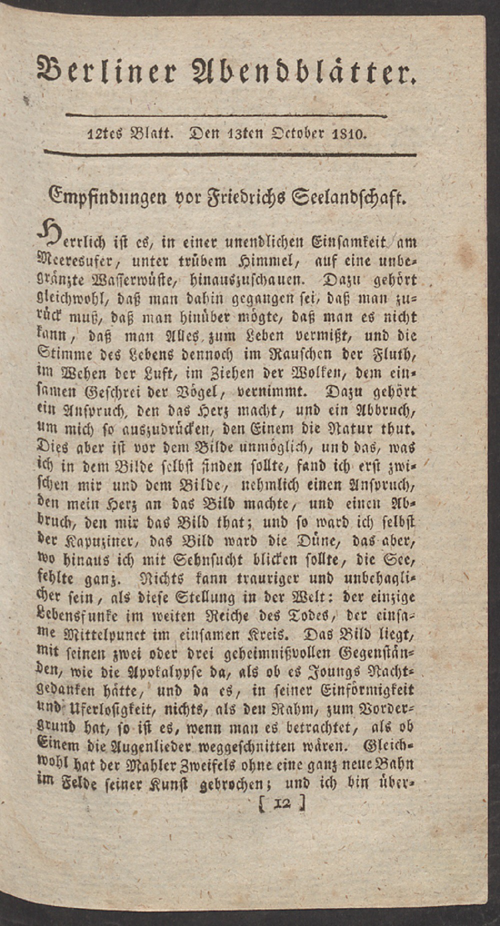 Herrlich ist es, in einer unendlichen Einsamkeit amMeeresufer, unter trübem Himmel, auf eine unbegränzte Wasserwüste, hinauszuschauen. Dazu gehört gleichwohl, daß man dahin gegangen sei, daß man zurück muß, daß man hinüber mögte, daß man es nicht kann, daß man Alles zum Leben vermißt, und die Stimme des Lebens dennoch im Rauschen der Fluth, im Wehen der Luft, im Ziehen der Wolken, dem einsamen Geschrei der Vögel, vernimmt. Dazu gehört ein Anspruch, den das Herz macht, und ein Abbruch, um mich so auszudrücken, den Einem die Natur thut. Dies aber ist vor dem Bilde unmöglich, und das, was ich in dem Bilde selbst finden sollte, fand ich erst zwischen mir und dem Bilde, nehmlich einen Anspruch, den mein Herz an das Bild machte, und einen Abbruch, den mir das Bild that; und so ward ich selbst der Kapuziner, das Bild ward die Düne, das aber, wo hinaus ich mit Sehnsucht blicken sollte, die See, fehlte ganz. Nichts kann trauriger und unbehaglicher sein, als diese Stellung in der Welt: der einzige Lebensfunke im weiten Reiche des Todes, der einsame Mittelpunct im einsamen Kreis. Das Bild liegt, mit seinen zwei oder drei geheimnißvollen Gegenständen, wie die Apokalypse da, als ob es Joungs Nachtgedanken hätte, und da es, in seiner Einförmigkeit und Uferlosigkeit, nichts, als den Rahm, zum Vordergrund hat, so ist es, wenn man es betrachtet, als ob Einem die Augenlieder weggeschnitten wären. Gleichwohl hat der Mahler Zweifels ohne eine ganz neue Bahn im Felde seiner Kunst gebrochen; und ich bin über ...