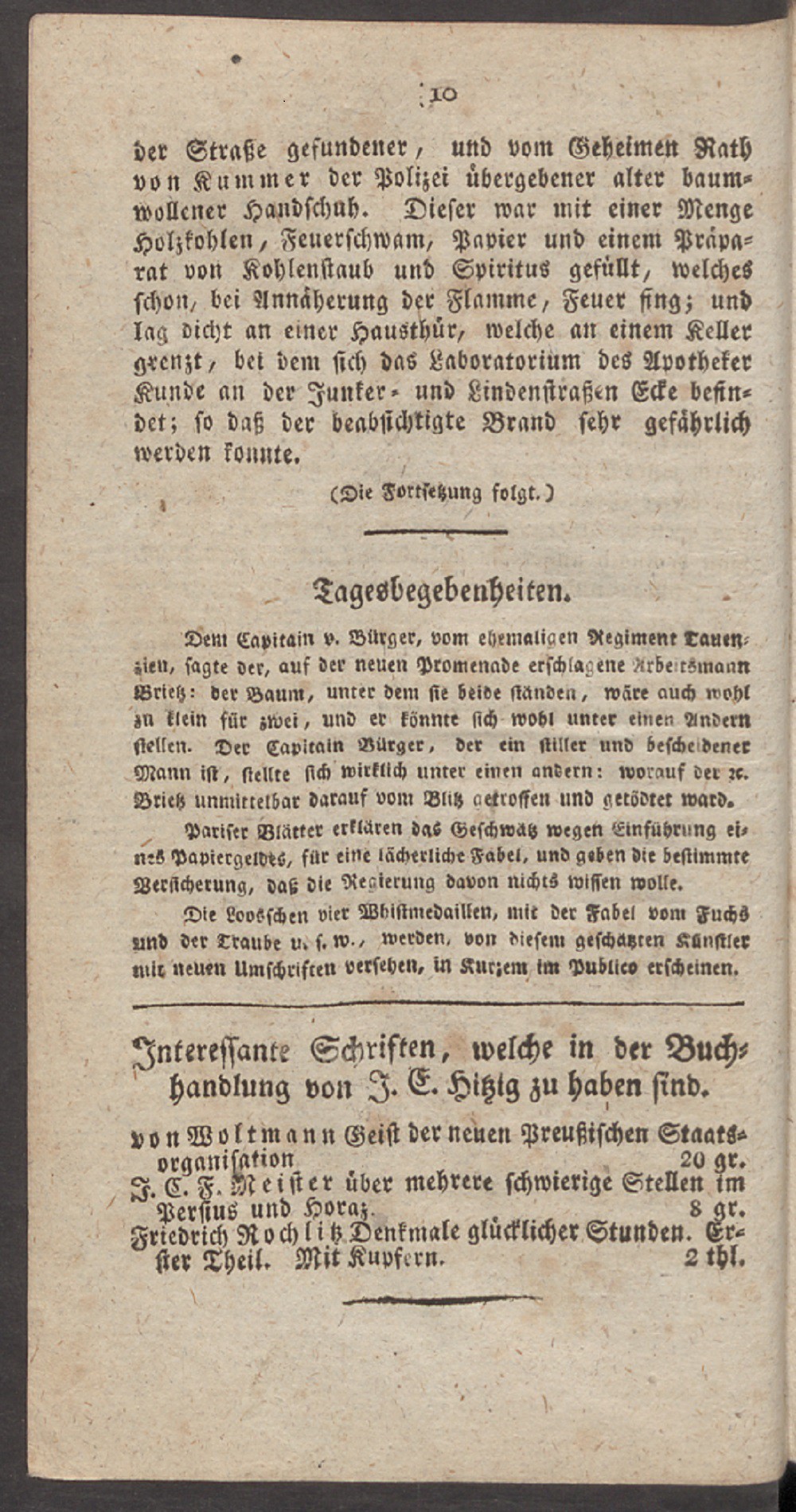 Dem Capitain v. Bürger, vom ehemaligen Regiment Tauenzien, sagte der, auf der neuen Promenade erschlagene Arbeitsmann Brietz: der Baum, unter dem sie beide ständen, wäre auch wohl zu klein für zwei, und er könnte sich wohl unter einen Andern stellen. Der Capitain Bürger, der ein stiller und bescheidener