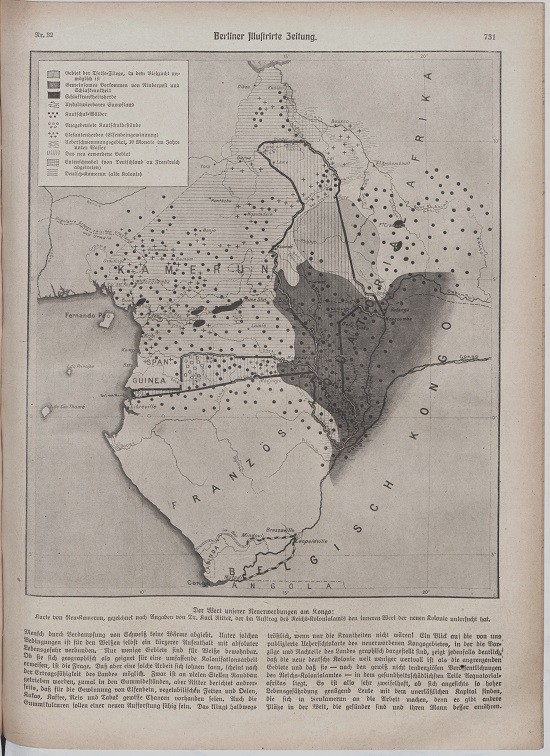 (731) Der Wert unserer Neuerwerbungen am Kongo: Karte von Neu-Kamerun, gezeichnet nach Angaben von Dr. Karl Ritter, der im Auftrag des Reichs-Kolonialamts den inneren wert der neuen Kolonie untersucht hat.