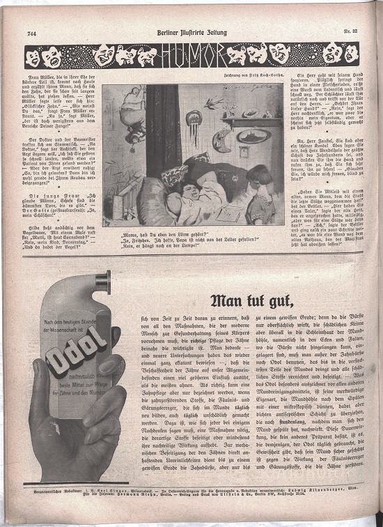 sich von Zeit zu Zeit daran zu erinnern, daß von all den Maßnahmen, die der moderne Mensch zur Gesunderhaltung seines Körpers vornehmen muß, die richtige Pflege der Zähne beinahe die wichtigste ist. Man bedenke --- und neuere Untersuchungen haben das wieder einmal eklatant bewiesen --- , daß die Beschaffenheit der Zähne auf unser Allgemeinbefinden einen viel größeren Einfluß ausübt, als die meisten ahnen. Als richtig kann eine Zahnpflege aber nur bezeichnet werden, wenn die zahnzerstörenden Stoffe, die Fäulnis- und Gärungserreger, die sich im Munde täglich neu bilden, auch täglich unschädlich gemacht werden. Dazu ist, wie sich jeder bei einigem Nachdenken sagen muß, eine Maßnahme nötig, die derartige Stoffe beseitigt oder mindestens ihre nachteilige Wirkung aufhebt. Zur mechanischen Beseitigung der den Zähnen direkt anhaftenden Unreinlichkeiten dient bis zu einem gewissen Grade die Zahnbürste, aber nur bis zu einem gewissen Grade; denn da die Bürste nur oberflächlich wirkt, die schädlichen Keime aber überall in die Schleimhaut der Mundhöhle, namentlich in den Ecken und Falten, wo die Bürste nicht hingelangen kann, eingelagert sind, muß man außer der Zahnbürste noch Odol benutzen, das bis in die verstecktesten Teile des Mundes dringt und alle schädlichen Stoffe vernichtet und beseitigt. --- Was das Odol besonders auszeichnet vor allen anderen Mundreinigungsmitteln, ist seine merkwürdige Eigenart, die Mundhöhle nach dem Spülen mit einer mikroskopisch dünnen, dabei aber dichten antiseptischen Schicht zu überziehen, die noch stundenlang, nachdem man sich den Mund gespült hat, nachwirkt. Diese Dauerwirkung, die kein anderes Präparat besitzt, ist es, die demjenigen, der Odol täglich gebraucht, die Gewißheit gibt, daß sein Mund sicher geschützt ist gegen die Wirkung der Fäulniserreger und Gärungsstoffe, die die Zähne zerstören.