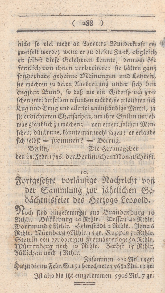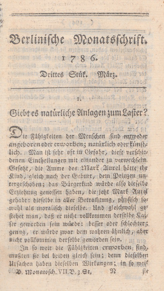 Berlin, den 28. Februar 1786. Die Herausgeber der Berlinischen Monatsschrift