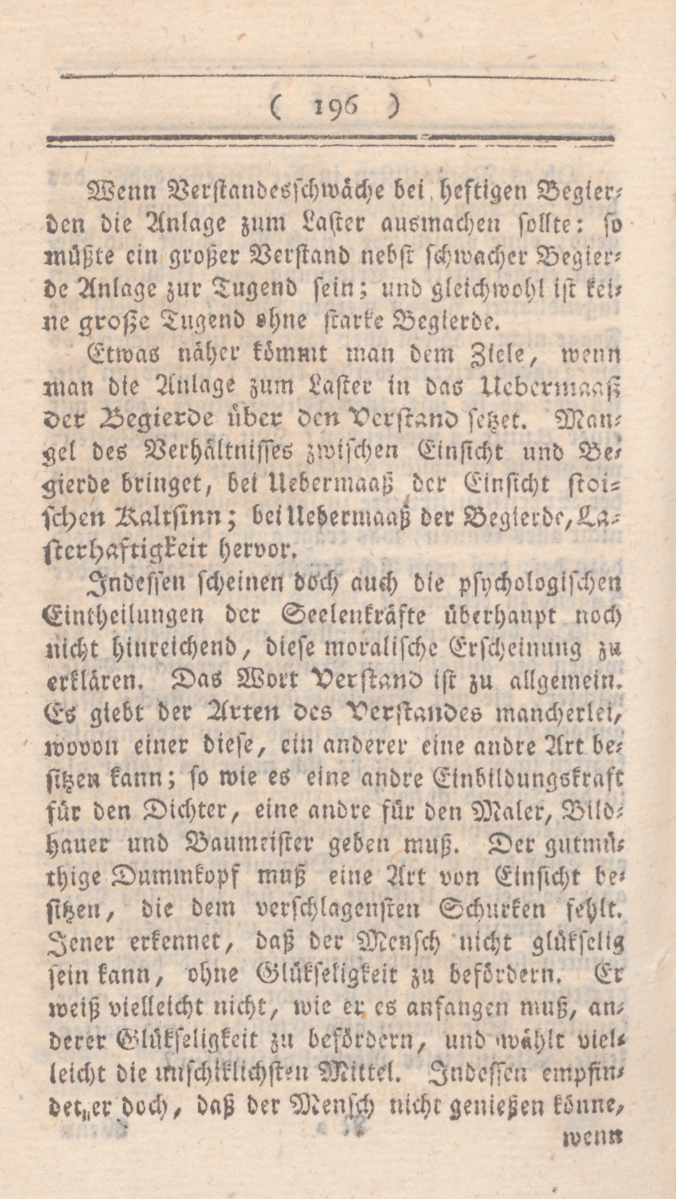 Wenn Verstandesschwäche bei heftigen Begierden die Anlage zum Laster ausmachen sollte: so müßte ein großer Verstand nebst schwacher Begierde Anlage zur Tugend sein; und gleichwohl ist keine große Tugend ohne starke Begierde.