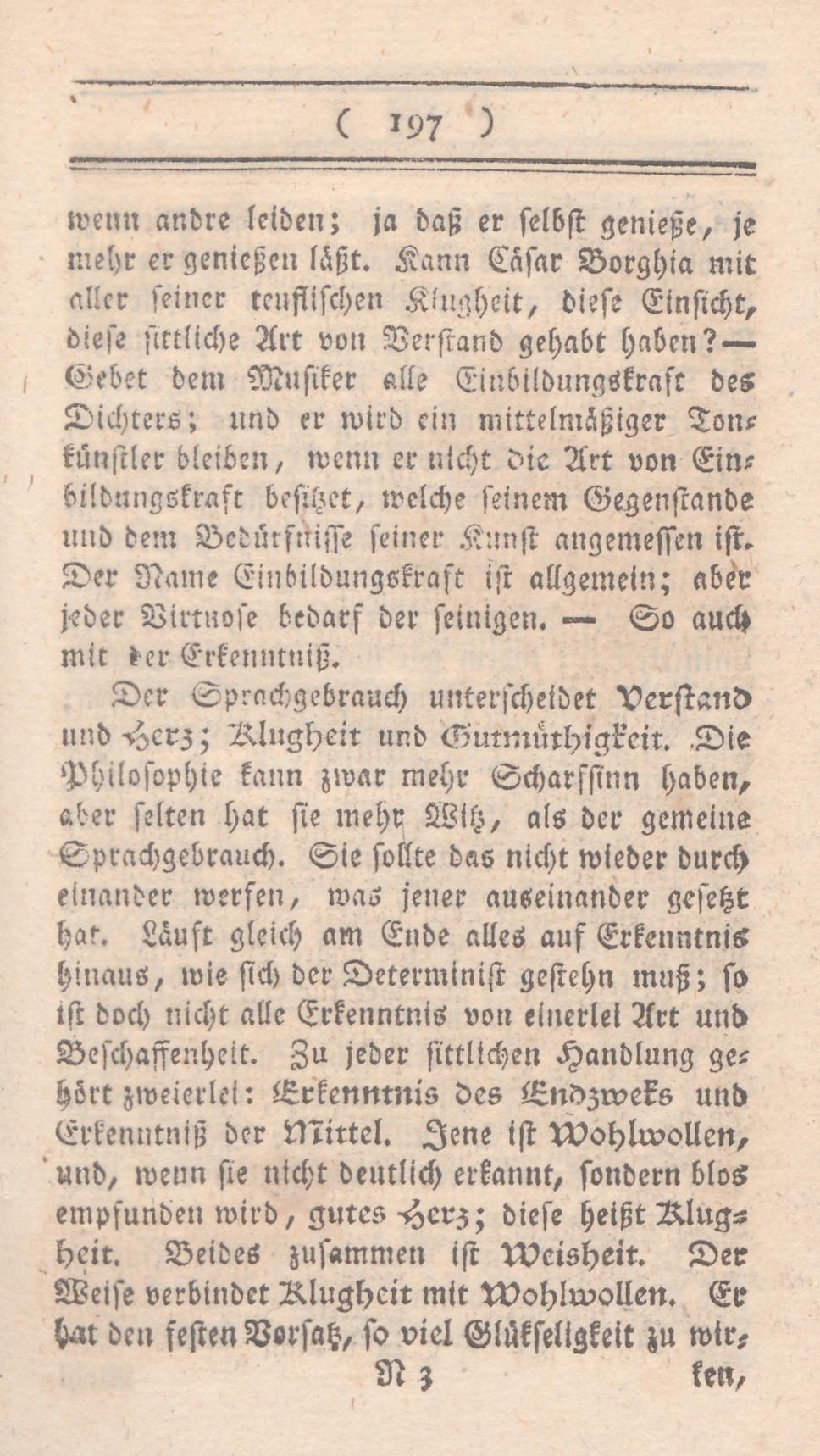 wenn andere leiden; ja daß er selbst genieße, je mehr er genießen läßt. Kann Cäsar Borghia mit all seiner teuflischen Klugheit, diese Einsicht, diese sittliche Art von Verstand gehabt haben? – Gebet dem Musiker alle Einbildungskraft des Dichters; und er wird ein mittelmäßiger Tonkünstler bleiben, wenn er nicht die Art von Einbildungskraft besitzet, welche seinem Gegenstande und dem Bedürfnisse seiner Kunst angemessen ist. Der Name Einbildungskraft ist allgemein; aber jeder Virtuose bedarf der seinigen. – So auch mit der Erkenntniß.