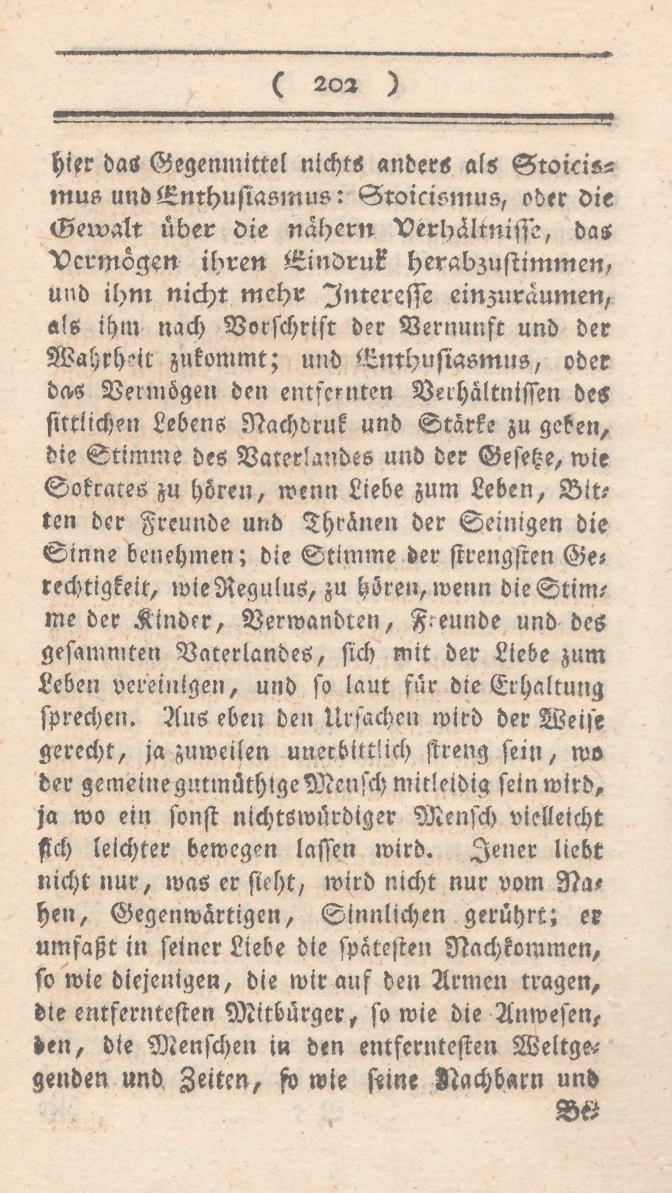 hier das Gegenmittel nichts anders als Stoicismus und Enthusiasmus: Stoicismus, oder die Gewalt über die nähern Verhältnisse, das Vermögen ihren Eindruk herabzustimmen, und ihm nicht mehr Interesse einzuräumen, als ihm nach Vorschrift der Vernunft und der Wahrheit zukommt; und Enthusiasmus, oder das Vermögen den entfernten Verhältnissen des sittlichen Lebens nachdruk und Stärke zu geben, die Stimme des Vaterlandes und der Gesetze, wie Sokrates zu hören, wenn Liebe zum Leben, Bitten der Freunde und Thränen der Seinigen die Sinne benehmen; die Stimme der strengsten Gerechtigkeit, wie Regulus, zu hören, wenn die Stimme der Kinder, Verwandten, Freunde und des gesammten Vaterlandes, sich mit der Liebe zum Leben vereinigen, und so laut für die Erhaltung sprechen. Aus eben den Ursachen wird der Weise gerecht, ja zuweilen unerbittlich streng sein, wo der gemeine gutmüthige Mensch mitleidig sein wird, ja wo ein sonst nichtswürdiger Mensch vielleicht sich leichter bewegen lassen wird. Jener liebt nicht nur, was er sieht, wird nicht nur vom Nahen, Gegenwärtigen, Sinnlichen gerührt; er umfaßt in seiner Liebe die spätesten Nachkommen, so wie diejenigen, die wir auf den Armen tragen, die entferntesten Mitbürger, so wie die Anwesenden, die Menschen in den entferntesten Weltgegenden und Zeiten, so wie seine Nachbarn und