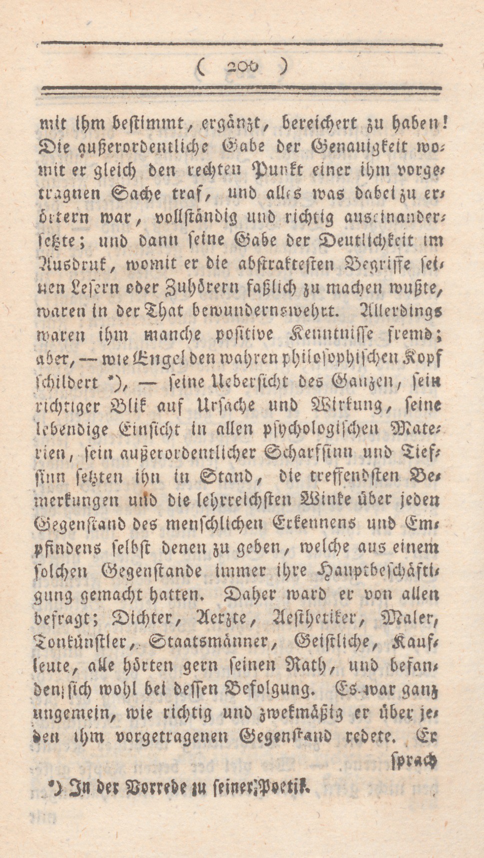 mit ihm bestimmt, ergänzt, bereichert zu haben! Die außerordentliche Gabe der Genauigkeit womit er gleich den rechten Punkt einer ihn vorgetranen Sache traf, und alles was dabei zu erörtern war, vollständig und richtig auseinandersetzte; und dann seine Gabe der Deutlichkeit im Ausdruk, womit er die abstraktesten Begriffe seinen Lesern oder Zuhörern faßlich zu machen wußte, waren in der That bewundernswehrt. Allerdings waren ihm manche positive Kenntnisse fremd; aber, – wie Engel den wahren philosophischen Kopf schildert ), – seine Uebersicht des Ganzen, sein richtiger Blik auf Ursache und Wirkung, seine lebendige Einsicht in allen psychologischen Materien, sein außerordentlicher Scharfsinn und Tiefsinn setzten ihn in Stand, die treffendsten Bemerkungen und lehrreichsten Winke über jeden Gegenstand des menschlichen Erkennens und Empfindens selbst denen zu geben, welche aus einem solchen Gegenstande immer ihre Hauptbeschäftigung gemacht hatten. Daher war er von allen befragt; Dichter, Aerzte, Aesthetiker, Maler, Tonkünstler, Staatsmänner, Geistliche, Kaufleute, alle hörten gern seinen Rath, und befanden sich wohl bei dessen Befolgung. Es war ganz ungemein, wie richtig und zwekmäßig er über jeden ihm vorgetragenen Gegenstand redete. Er