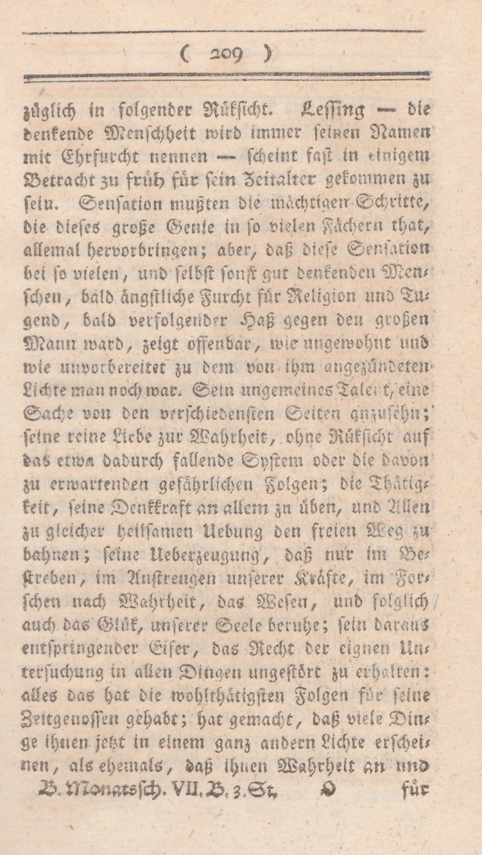 züglich in folgender Rüksicht. Lessing – die denkende Menschheit wird immer seinen Namen mit Ehrfurcht nennen – scheint fast in einigem Betracht zu früh für sein Zeitalter gekommen zu sein. Sensation mußten die mächtigen Schritte, die dieses große Genie in so vielen Fächern that, allemal hervorbringen; aber, daß diese Sensation bei so vielen, und selbst sonst gut denkenden Menschen, bald ängstliche Furcht für Religion und Tugend, bald verfolgender Haß gegen den großen Mann ward, zeigt offenbar, wie ungewohnt und wie unvorbereitet zu dem von ihm angekündigten Lichte man noch war. Sein ungemeines Talent, eine Sache von den verschiedensten Seiten anzusehn; seine reine Liebe zur Wahrheit, ohne Rüksicht auf das etwa dadurch fallende System oder die davon zu erwartenden gefährlichen Folgen; die Thätigkeit, seine Denkkraft an allem zu üben, und Allen zu gleicher heilsamenUebung den freien Weg zu bahnen; seine Ueberzeugung, daß nur im Bestreben, im Anstrengen unserer Kräfte, im Forschen nach Wahrheit, das Wesen, und folglich auch das Glük, unserer Seele beruhe; sein daraus entspringender Eifer, das Recht der eignen Untersuchung in allen Dingen ungestört zu erhalten: alles das hat die wohlthätigsten Folgen für seine Zeitgenossen gehabt; hat gemacht, viele Dinge ihnen jetzt in einem ganz andern Lichte erscheinen, als ehemals, daß ihnen Wahrheit an und