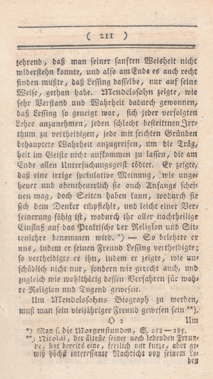 lehrend, daß man seiner sanften Weisheit nicht widerstehn konnte, und also am Ende es auch recht finden mußte, daß Lessing dasselbe, nur auf seine Weise, gethan habe. Mendelssohn zeigte, wie sehr Verstand und Wahrheit auch durch dadurch gewonnen, daß Lessing geneigt war, sich jeder verfolgten Lehre anzunehmen, jeden schlecht bestrittenen Irrthum zu vertheidigen, jede mit seichten Gründen behauptete Wahrheit anzugreifen, um die Trägheit im Geiste nicht aufkommen zu lassen, die am Ende allen Untersuchungsgeiost tödtet. Er zeigte, daß eine irrige spekulative Meinung, wie ungeheuer und abentheuerlich sie auch Anfangs scheinen mag, doch Seiten haben kann, wodurch sie sich dem Denker empfiehlt, und leicht einer Verfeinerung fähig ist, wodurch ihr aller nachtheilige Einfluß auf das Praktische der Religion und Sittenlehre benommen wird. *) – So belehrte er uns, indem er seinen Freund Lessimng vertheidigte; so vertheidigte er ihn, indem er zeigte, wie unschädlich nicht nur, sondern wie gerecht auch, und zugleich wie wohlthätig dessen Verfahren für wahre Religion und Tugend gewesen.