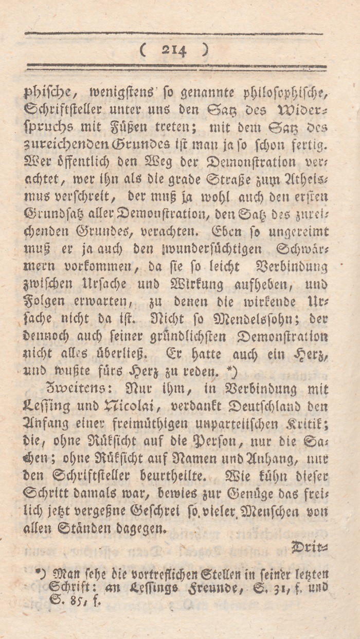 phische, wenigstens so genannte philosophische, Schriftsteller unter uns den Satz des Widerspruchs mit Füßen treten; mit dem Satz des zureichenden Grundes ist man ja so schon fertig. Wer öffentlich den Weg der Demonstration verachtet, wer ihn als die grade Straße zum Atheismus verschreit, der muß ja wohl auch den ersten Grundsatz aller Demonstration, den Satz des zureichenden Grundes, verachten. Eben so ungereimt muß er ja auch den wundersüchtigen Schwärmern vorkommen, , da sie so leicht Verbindung zwischen Ursache und Wirkung aufheben, und Folgen erwarten, zu denen die wirkende Ursache nicht da ist. Nicht so Mendelssohn; der dennoch auch seiner gründlichsten Demonstration nicht alles überließ. Er hatte auch ein Herz, und wußte fürs Herz zu reden. *)