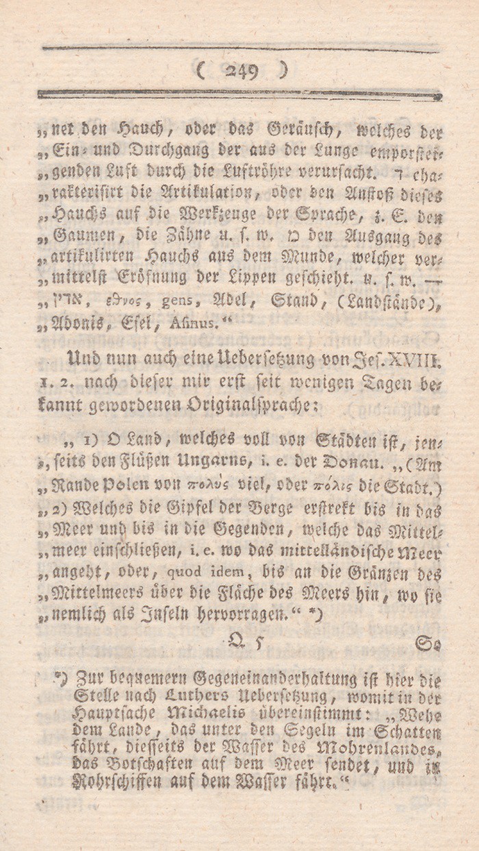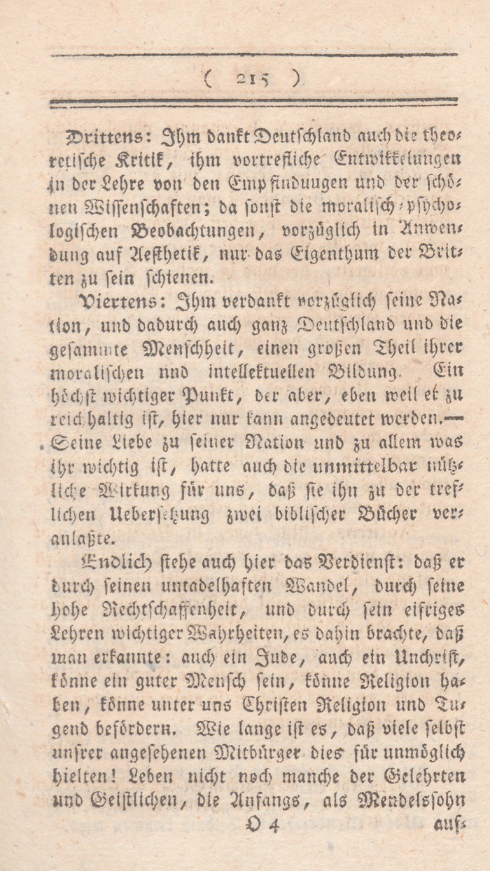 Viertens: Ihm verdankt vorzüglich seine Nation, und dadurch auch ganz Deutschland und die gesammte Menschheit, einen großen Theil ihrer moralischen und intellektuellen Bildung. Ein höchst wichtiger Punkt, der aber, eben weil er zu reichhaltig ist, hier nur kann angedeutet werden. – Seine Liebe zu seiner Nation und zu allem was ihr wichtig ist, hatte auch die unmittelbar nützliche Wirkung für uns, daß sie ihn zu der treflichen Uebersetzung zwei biblischer Bücher veranlaßte.