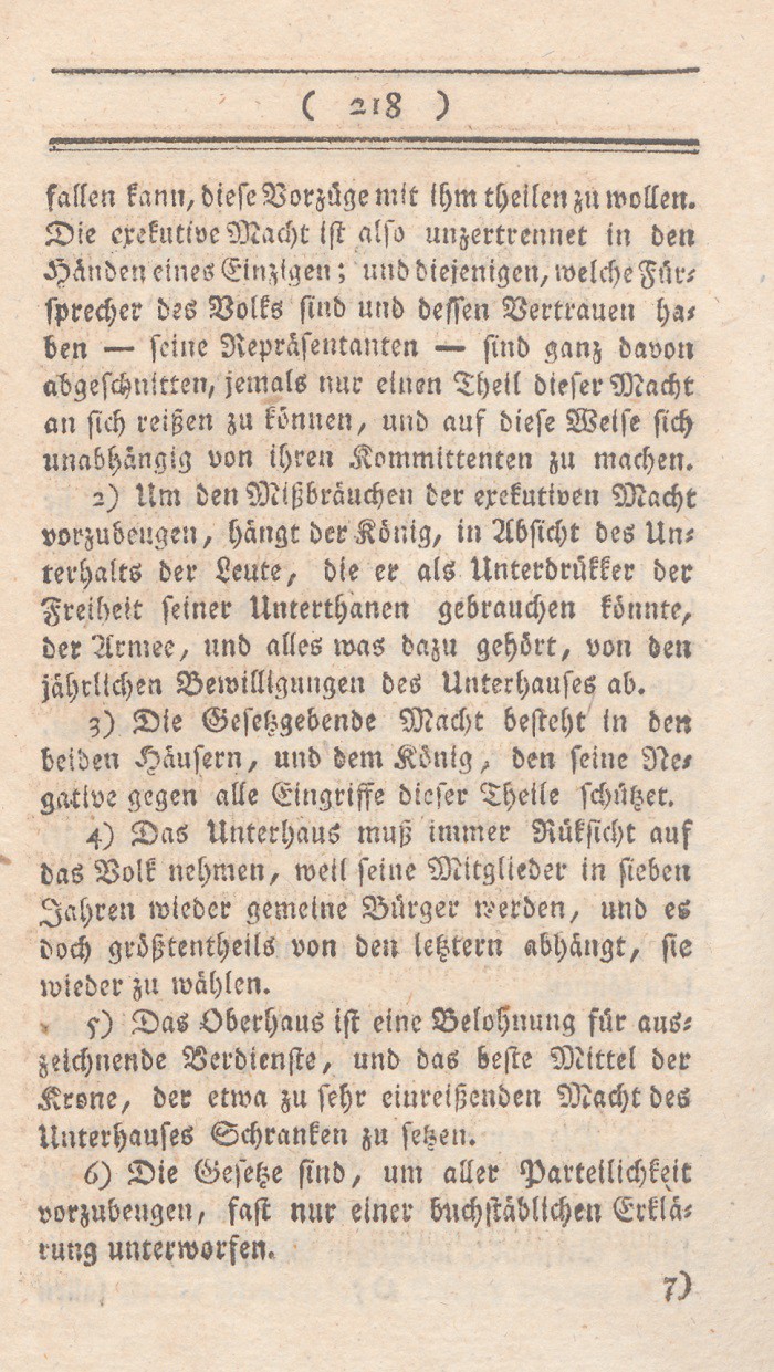 4. Das Oberhaus ist eine Belohnung für auszeichnende Verdienste, und das beste Mittel der Krone, der etwa zu sehr einreißenden Macht desUnterhauses Schranken zu lenken.