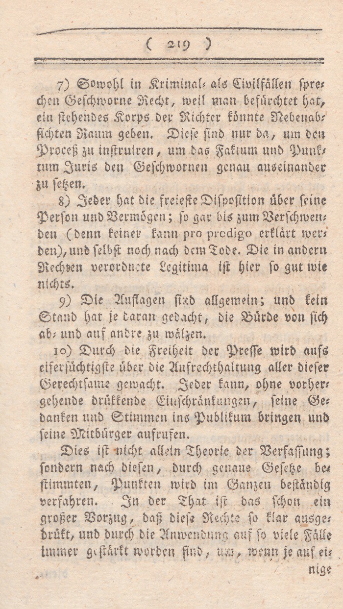 1. Sowohl in Criminal- als Civilfällen sprechen Geschworene Recht, weil man befürchtet hat, ein stehendes Korps der Richter könnte NebenabsichtenRaum geben. Diese sind nur da, um den Prozeß zu instruiren, um das Faktum und Punktum Juris den Geschworenen genau auseinander zu setzen.