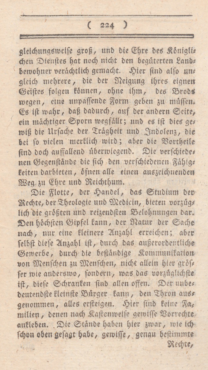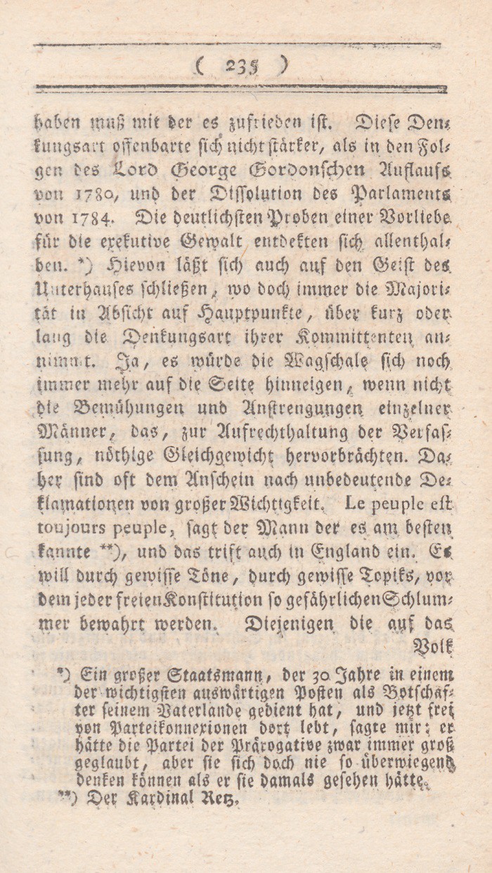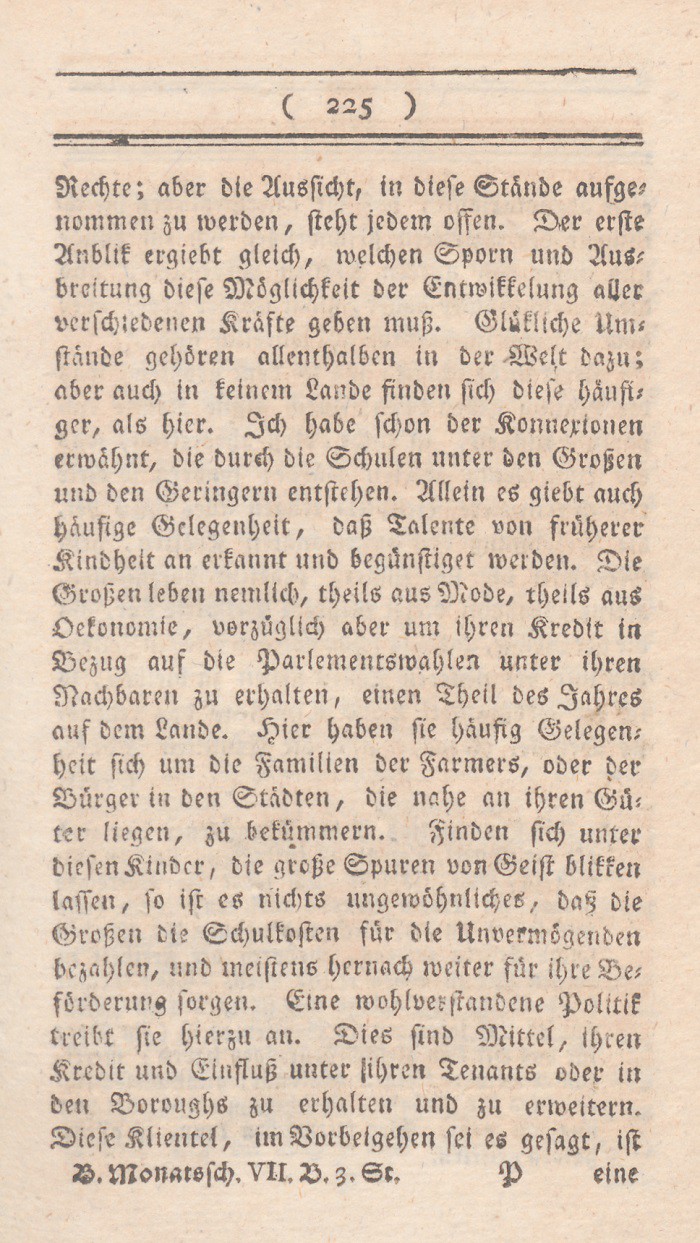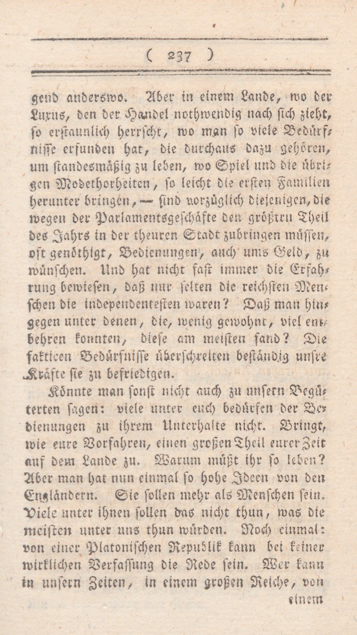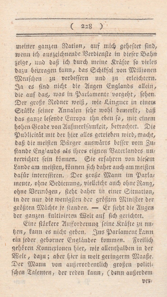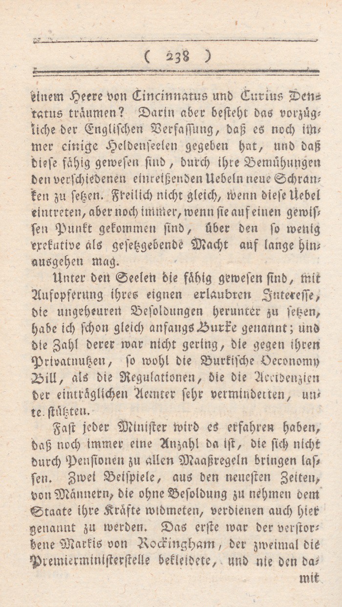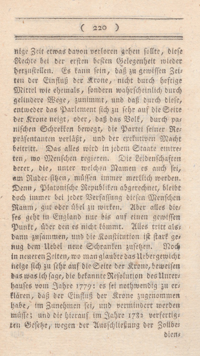 In dem vorhergehenden Abschnitt sind die Mißdeutungen des Wortes Freiheit entwikkelt worden. Ich setze nun meine eigne Erklärung dieses Begrifs hinzu, nebst den Gründen warum ich glaube, daß sie auf England paßt. Der freieste Staat ist der, wo jeder nur denjenigen Theil seiner freien Handlungen aufopfert, den durchaus die Aufrechthaltung des gemeinen Wesens erfordert; wo solcheEinschränkungen nicht auf eine parteiische sondern auf eine bestimmte allgemeine Weise geschehen, nur um damit die Summe der allgemeinen Glükseligkeit zu vermehren; wo in den Vortheilen, die Personen und Ständen ertheilt werden, nur Rüksicht auf feste Regierungsform und muthmaßliche Verdienste aufgenommen wird; mit einem Worte, wo die meisten Kräfte sich neben einander entwikkeln können.