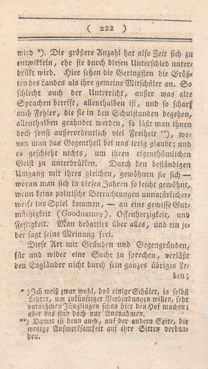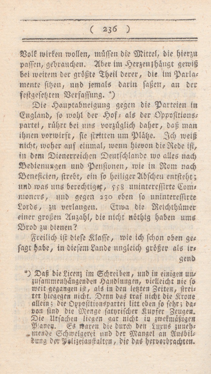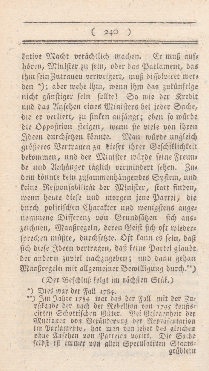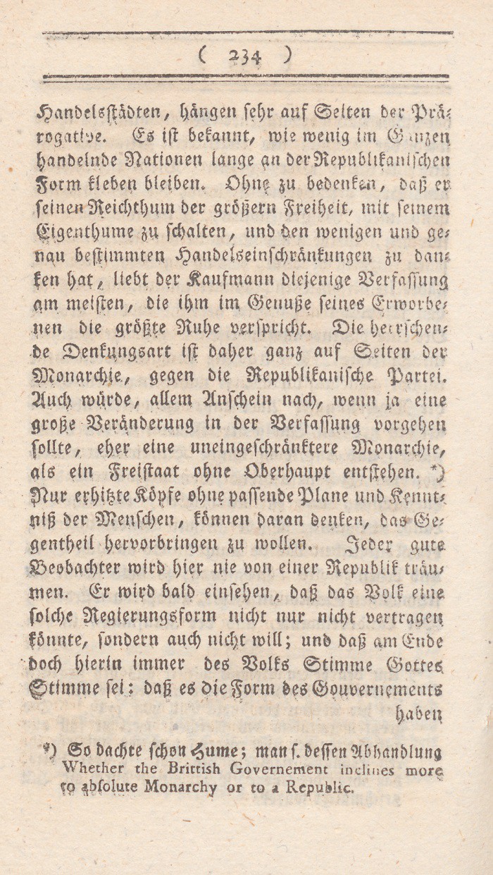 *) Dasselbe Gesuch gestattete wie oben S. 226 Note gezeigt worden, ein kath. Geistlicher. Wenn aber von der Denkungsart einer Partei die Rede ist; so muß man ( wie H. Garve oft und richtig erwähnt) nicht auf einzelne Handlungen einzelner Menschen, sondern auf die Repräsentanten der ganzen Partei sehen.