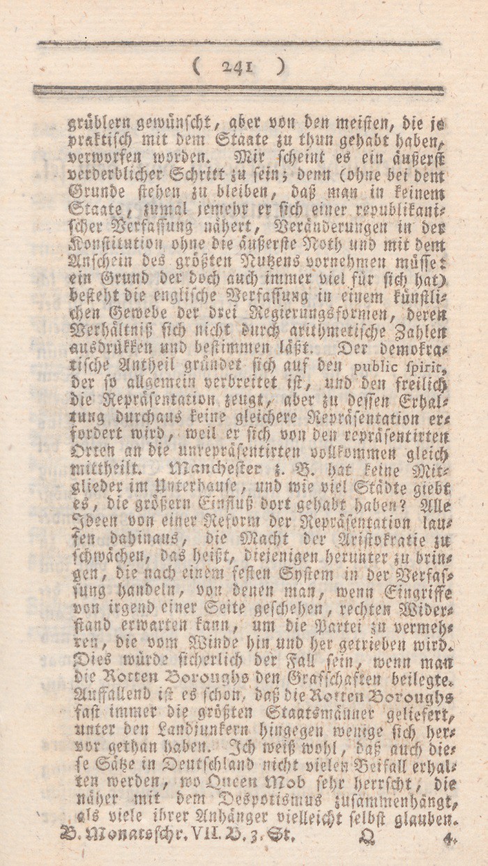3. Das Unterhaus muß immer Rüksicht auf das Volk nehmen, weil seine Mitglieder in sieben Jahren wieder gemeine Bürger werden, und es doch größtentheils von den letztern abhängt, sie wieder zu wählen.