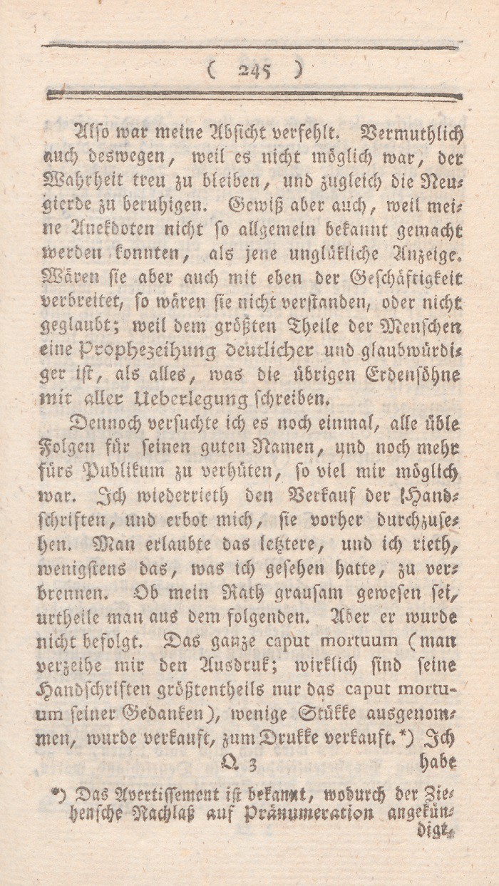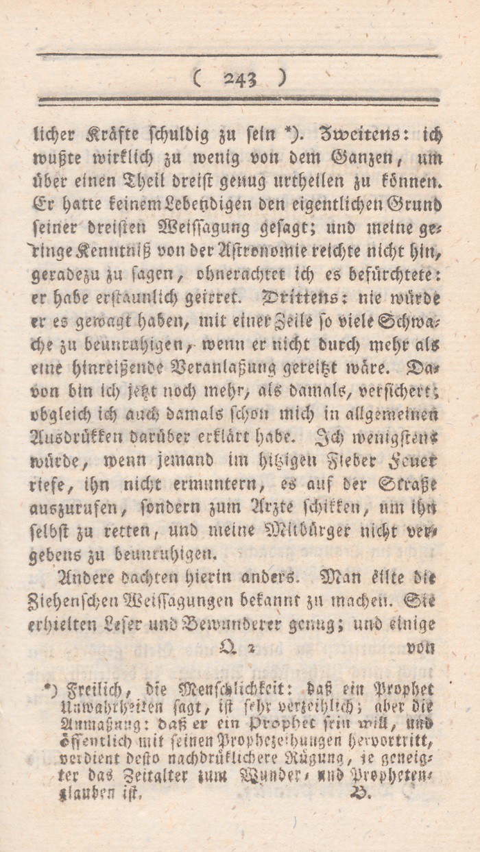 *) Denn es ist, um nur ein einziges Faktum zu nennen doch wohl nicht vernünftig, seine Frau so lange zu streichen, bis sie Visionen und Divination bekömmt? doch wohl nicht vernünftig, irgend einen Brief den man schreibt, für so wahrhaft als Gottes Wort auszugeben? Berl. Monatsschr. 1785, Novemb. S. 437 f.