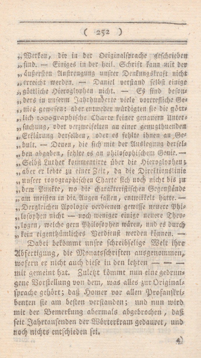 Diese Stelle macht, wie ich sehe, viele und eben so mannigfaltige Sensation. Von der einen Seite ist es ernsthaften Freunden der Wahrheit leid, daß sich ein großer und liebenswürdiger Philosoph, der von wirklichen Christen so aufrichtigverehrt worden, konnte hinreißen lassen, einen so abgenutzten Einfall auf Kosten des Christenthums niederzuschreiben. Vonder anderen höre ich diesen Gedankenhin und wieder als Autorität wiederholen, wo man sich eigenes Nachdenken ersparen, und gern