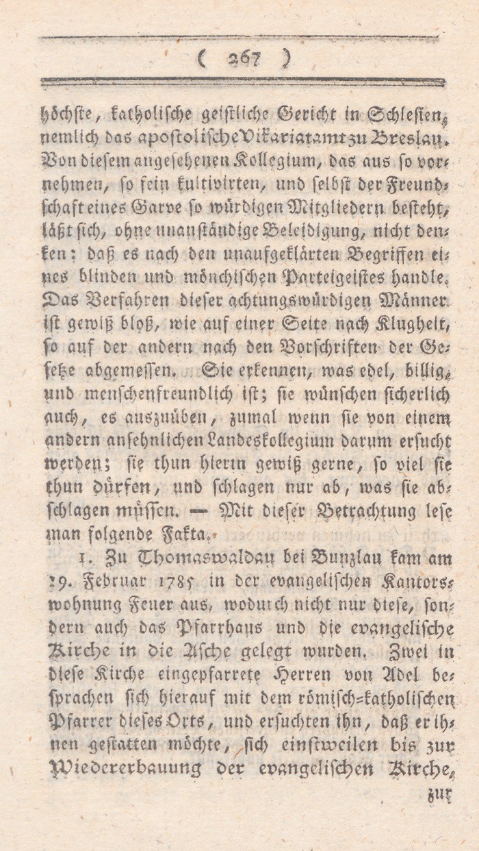 1. Zu Thomaswaldau bei Bunzlau kam am 19. Februar 1785 in der evangelischen Kantorswohnung Feuer aus, wodurch nicht nur diese, sondern auch das Pfarrhaus und die evangelische Lirche in die Asche gelegt wurden. Zwei in diese Kirche eingepfarrete Herren von Adel besprachen sich hierauf mit dem römisch-katholischen Pfarrer dieses Orts, und ersuchten ihn, daß er ihnen gestatten möchte, sich einstweilen bis zur Wiedererbauung der evangelischen Kirche,