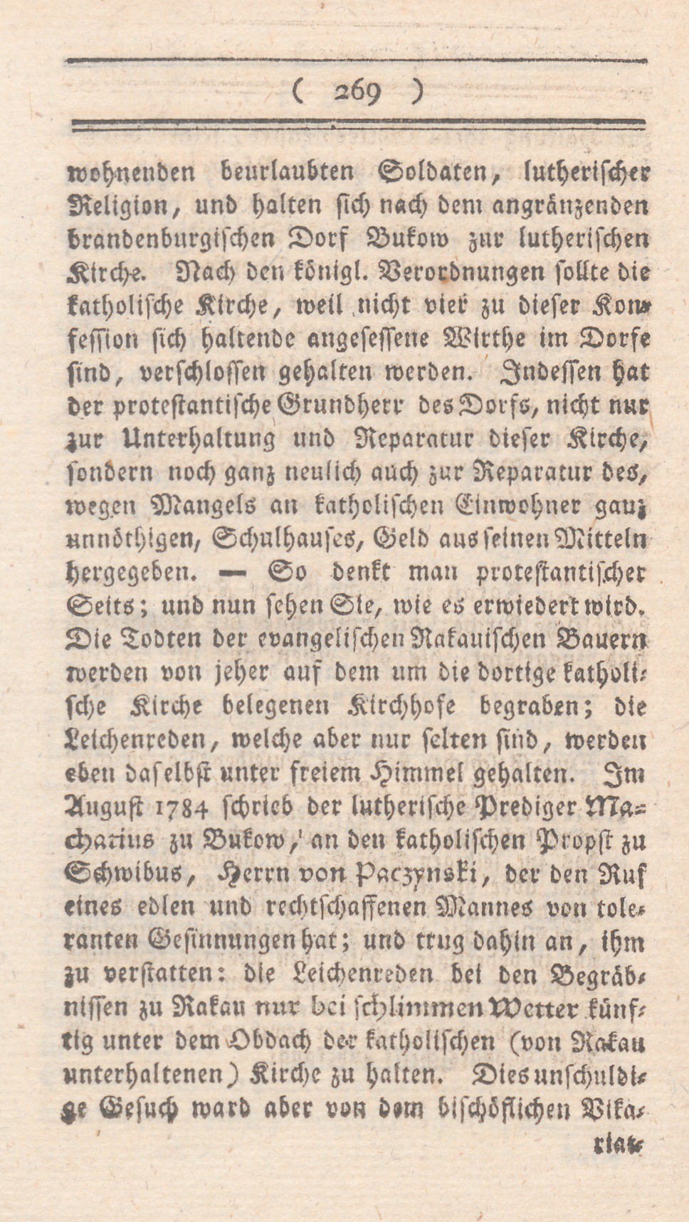 wohnenden beurlaubten Soldaten, lutherischer Religion, und halten sich nach dem angränzenden brandenburgischen Dorf Bukow zur lutherischen Kirche. Nach den königl. Verordnungen sollte die katholische Kirche, weil nicht vier zu dieser Konfession sich haltende angesessene Wirthe im Dorfe sind, geschlossen gehalten werden. Indessen hat der protestantische Grandherr des Dorfs, nicht nur zur Unterhaltung und Reparatur dieser Kirche, sondern noch ganz neulich auch zurReparatur des, wegen Mangels an katholischen Einwohner ganz unnöthigen Schulhauses, Geld aus seinen Mitteln hergegeben. – So denkt man protestantischer Seits; und nun sehen Sie, wie es erwiedert wird. Die Todten der evangelischen Kakauischen Bauern werden von jeher auf dem um die dortige katholische Kirche belegenen Kirchhofe begraben; die Leichenreden, welche aber nur selten sind, werden eben daselbst unter freiem himmel gehalten. Im August 1784 schrieb der lutherische Prediger Macharius zu Bukow, an den katholischen Probst zu Schwibus, Herrn von Paczynski, der den Ruf eines edlen und rechtschaffenen Mannes von toleranten Gesinnungen hat; und trug dahin an, ihm zu verstatten: die Leichenreden bei den Begräbnissen zu Kakau nur bei schlimmen wetter künftig unter dem Obdach der katholischen(von Kakau unterhaltenen) Kirche zu halten. Dies unschuldige Gesuch ward aber von dem bischöflichen Vika=