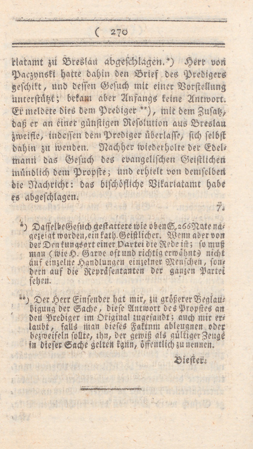 riatsamt zu Breslau abgeschlagen. *) Herr von Paczynski hatte dahin den Brief des Predigers geschikt, umnd dessen Gesuch mit einer Vorstellung unterstützt; bekam aber Anfangs keine Antwort. Er meldete dies dem Prediger **), mit dem Zusatz, daß eran einer günstigen Resolution aus Breslau zweifle, indessen dem Prediger überlasse, sich selbst dahinzu wenden. Nachher wiederholte der Edelmann das Gesuch des evangelischen Geistlichen mündlich dem probste; und erhielt von demselben die Nachricht: das bischöfliche Vikariatamt habe es abgeschlagen.