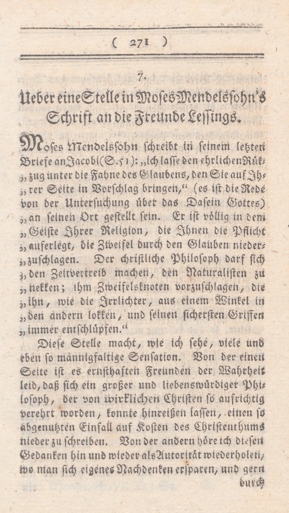Moses Mendelssohn schreibt in seinem letzten Briefe an Jacobi (s. 51): „ich lasse den ehrlichen Rükzug unter die Fahne des Glaubens, den Sie auf Ihrer Seite in Vorschlag bringen,“ (es ist die Rede von der Untersuchung über das Dasein Gottes) „an seinen Ort gestellt sein. Er ist völlig in dem Geiste Ihrer Religion, die Ihnen die Pflicht auferlegt, die Zweifel durch den Glauben niederzuschlagen. Der christliche Philosoph darf sich den Zeitvertreib machen, den Naturalisten zu nekken; ihm Zweifelsknoten vorzuschlagen, die ihn, wie die Irrlichter, aus einem Winkel in den andern lokken, und seinen sichersten Griffen immer entschlüpfen.“