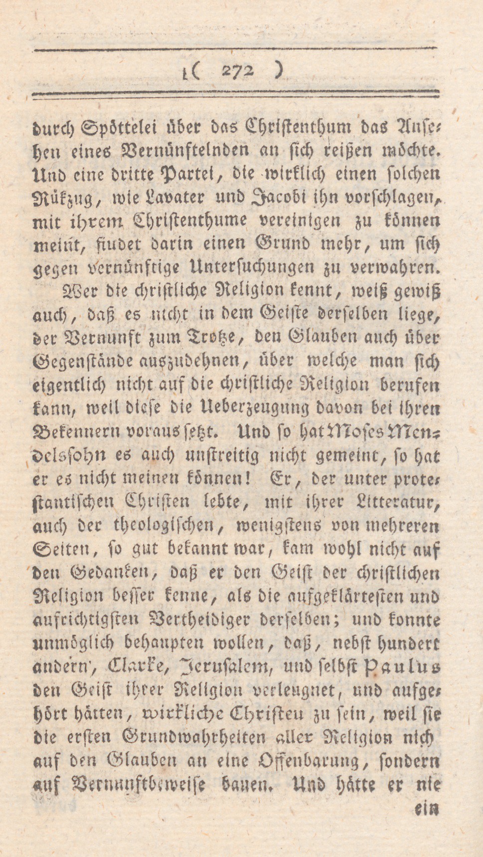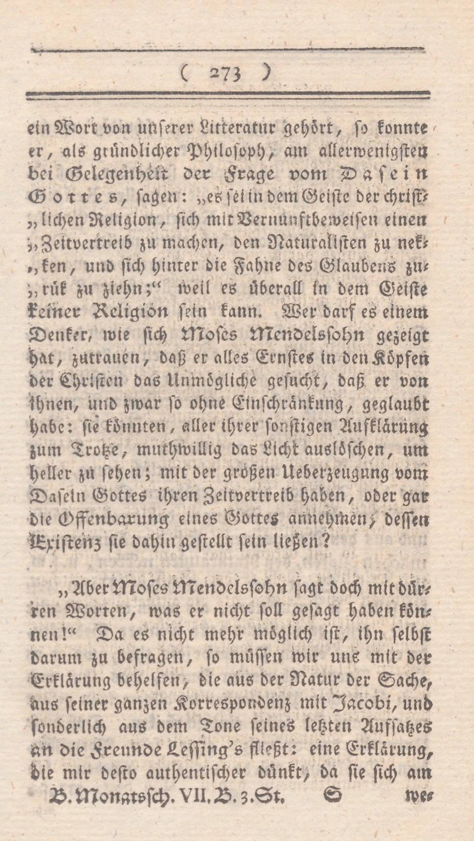 ein Wort von unserer Litteratur gehört, so konnte er, als gründlicher Philosoph, am allerwenigsten bei Gelegenheit der Frage vom Dasein Gottes, sagen: „es sei in dem Geiste der christlichen REligion, sich mit Vernunftbeweisen einen Zeitvertreib zu machen, den Naturalisten zu nekken, und sich hinter der Fahne des Glaubenszurük zu ziehn“; weil es ünerall indem Geiste keiner Religion sein kann. Wer darf es einem Denker, wie sich Moses Mendelssohn gezeigt hat, zutrauen, daß er allen ernstes in den Köpfen der Christen das Unmögliche sucht, daß er von ihnen, und zwar so ohne Einschräkung, geglaubt habe: sie könnten, aller ihrer sonstigen Aufklärung zum trotze, muthwillig das Licht auslöschen, um heller zu sehen; mit der großen Ueberzeugung vom Dasein Gottes ihren Zeitvertreib haben, oder gar die Offenbarung eines Gottes annehmen, dessen Existenz sie dahin gestellt sein ließen?