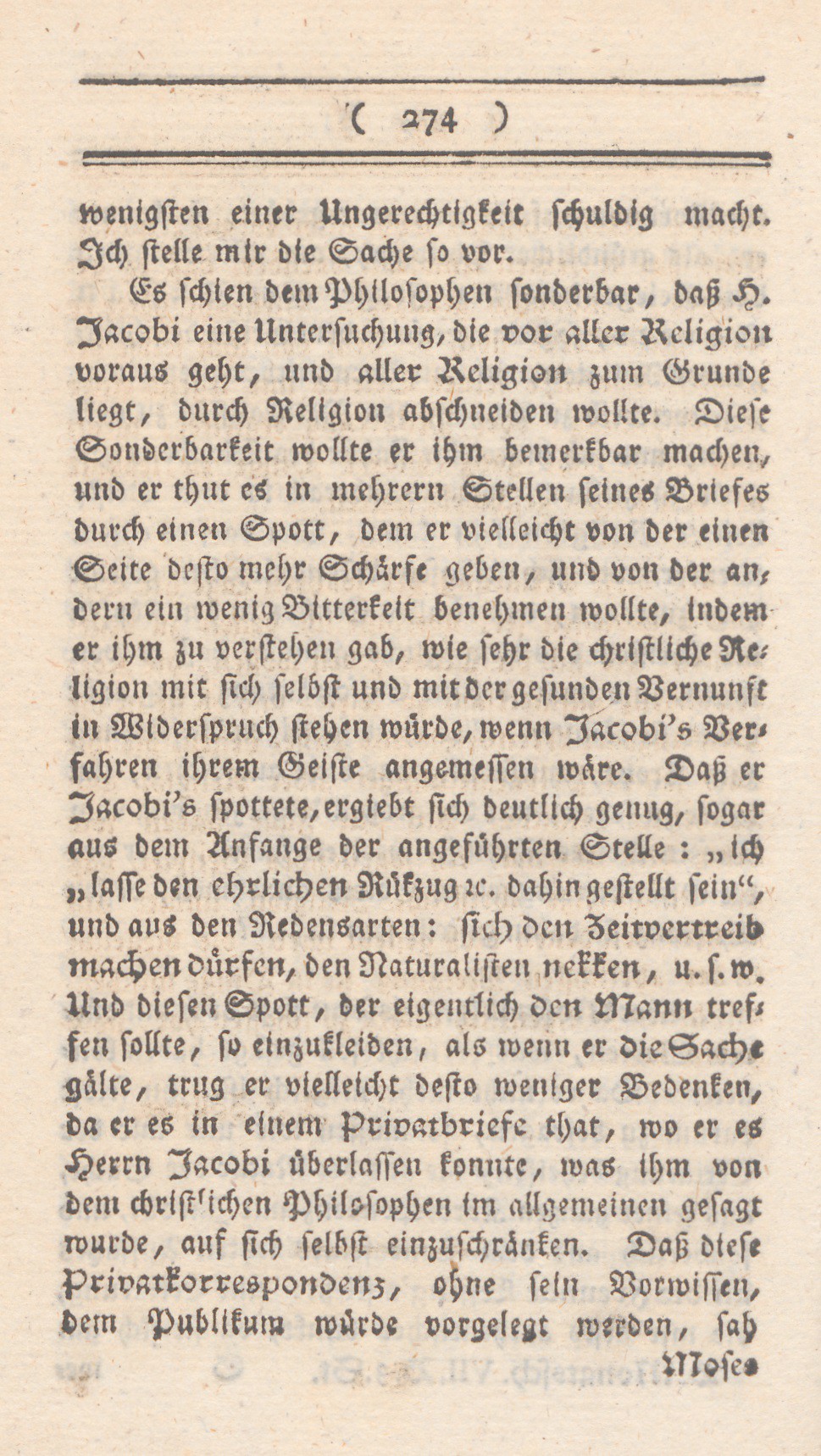 Es schien dem Philosophen sonderbar, daß H. Jacobi eine Untersuchung, die vor aller Religion voraus geht, und aller Religion zum Grunde liegt, durch Religion abschneiden wollte. Diese Sonderbarkeit wollte er ihm bemerkbar machen, und er thut es an mehrern Stellen seines Briefes durch einen Spott, dem er vielleicht von der einen seite desto mehr Schärfe geben, und von der andern ein wenig Bitterkeit benehmen wollte, indem er ihm zu verstehen gab, wie sehr die christliche Religion mit sich selbst und mit der gesunden Vernunf im Widerspruch stehen würde, wenn Jacobis Verfahren ihrem Geiste angemessen wäre. Daß er Jacobis spottete, ergiebt sich deutlich genug, sogar aus dem Anfange der angeführten Stelle: „ich lasse den ehrlichen RüRükzug dahingestellt sein“, und aus den Redensarten: sich den Zeitvertreib machen dürfen, den Naturlisten nekken, u.s.w. Und diesen Spott, der eigentlich den Mann treffen sollte, so einzukleiden, als wenn er der Sache gälte, trug er vielleicht desto weniger Bedenken, da er es in einem Privatbriefe that, wo er es Herrn Jacobi überlassen konnte, was ihm von dem christlichen Philosophen im allgemeinen gesagt wurde, auf sich selbst einzuschränken. Daß diese Privatkorrespondenz, ohne sein Vorwissen, dem Publikum würde vorgelegt werden, sah