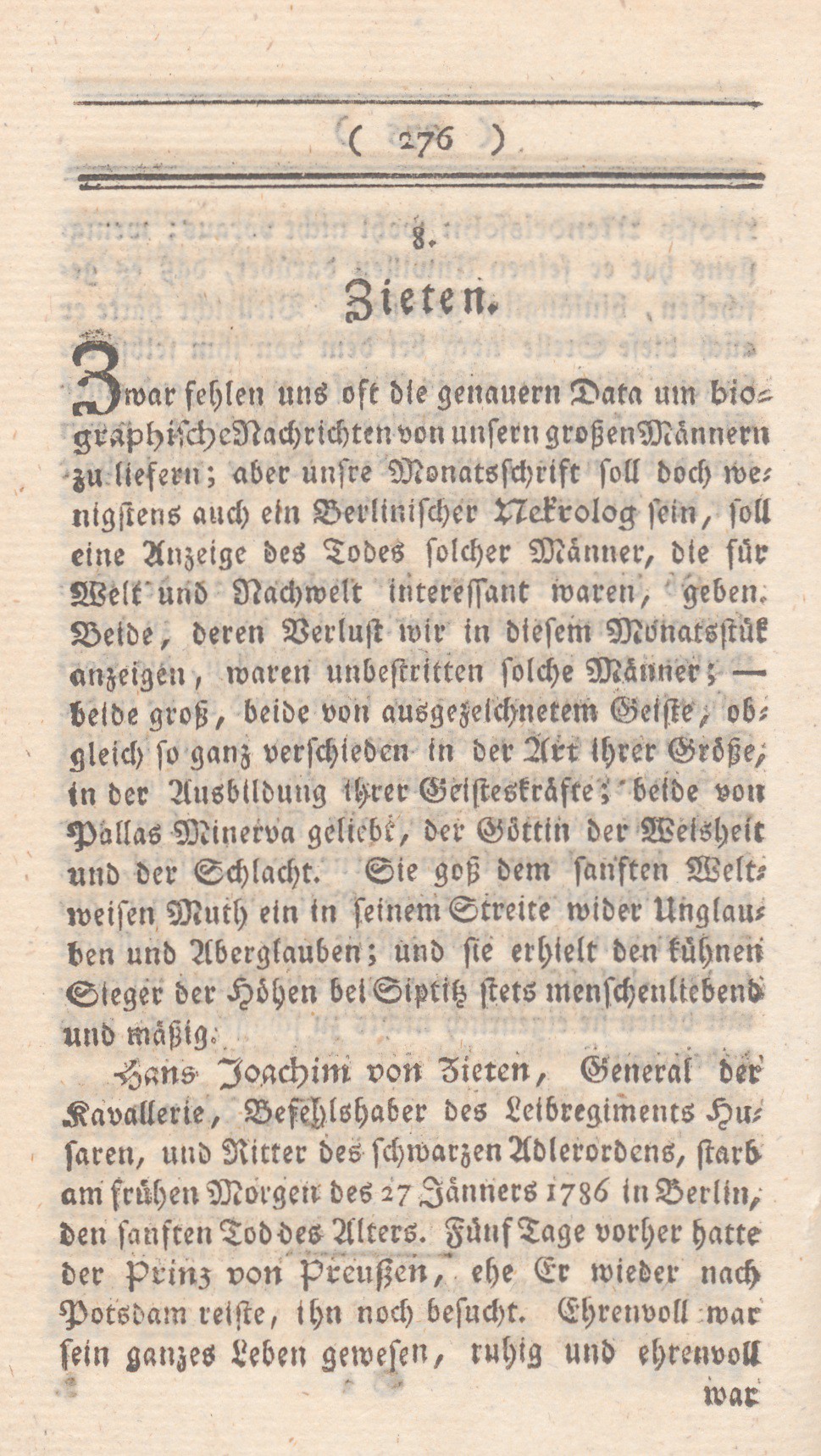 Hans Joachim von Zieten, General der Kavallerie, Befehlshaber des Leibregiments Husaren, und Ritter des schwarzen Adlerordens, starb am frühen Morgen des 27 Jänners 1786 in Berlin, den sanften Tod des Alters. Fünf Tage vorher hatte der Prinz von Preußen, ehe Er wieder nach Potsdam reiste, ihn noch besucht. Ehrenvoll warsein ganzes Leben gewesen, ruhig und ehrenvoll