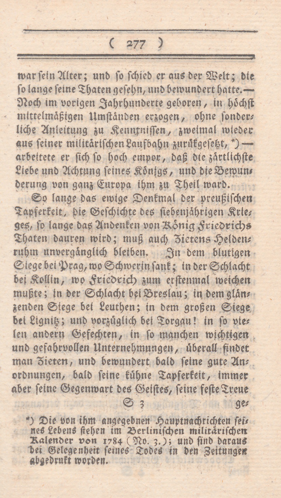 So lange das ewige Denkmal der preußischen Tapferkeit, die Geschichte des siebenjährigen Krieges, so lange das Andenken von König Friedrichs Thaten dauren wird; muß auch Zietens Heldenruhm unvergänglich bleiben. In dem blutigen Siege bei Prag, wo Schwerin sank; in der Schlacht bei Kollin, wo Friedrich zum erstenmal weichen mußte; in der Schlacht bei Breslau; in dem glänzenden Siege bei Leuthen; in dem großen Siege bei Lignitz; und vorzüglich bei Torgau! in so vielen andern Gefechten, in so manchen wichtigen und gefahrvollen Unternehmungen, überall findet man Zieten, und bewundert bald seine gute Anordnungen, bald seine kühne Tapferkeit, immer aber seine Gegenwart des Geistes, seine feste Treue