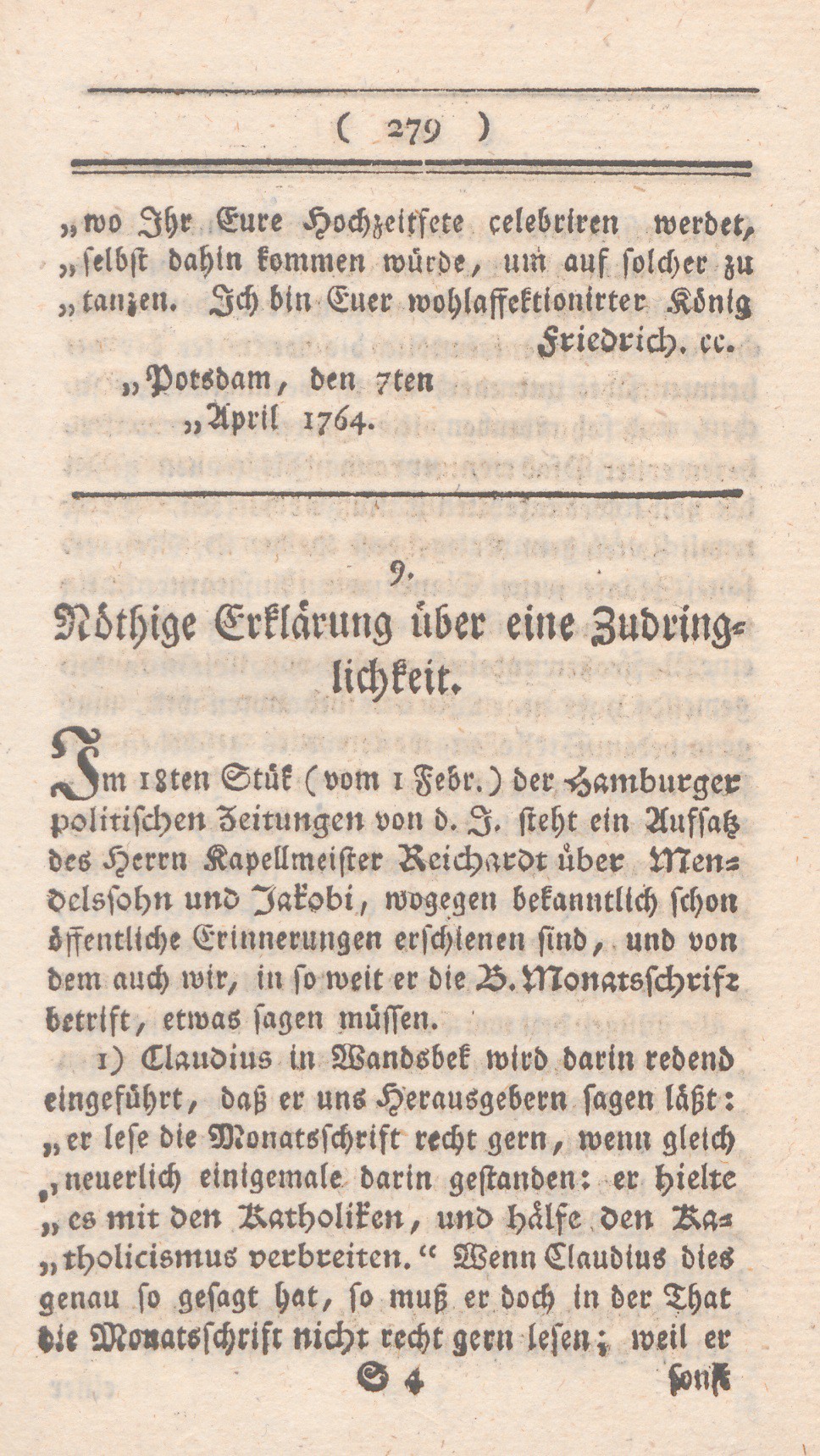1. Claudius in Wandsbek wird darin redend eingeführt. daß er uns Herausgebern sagen läßt: „er lese die Monatsschrift recht gern, wenn gleich neuerlich einigemale darin gestanden: er hielte es mit den Katholiken, und hälfe den Katholicismus verbreiten.“ Wenn Claudius dies genau so gesagt hat, so muß er doch in der That die Monatsschrift nicht recht gern lesen; weil er