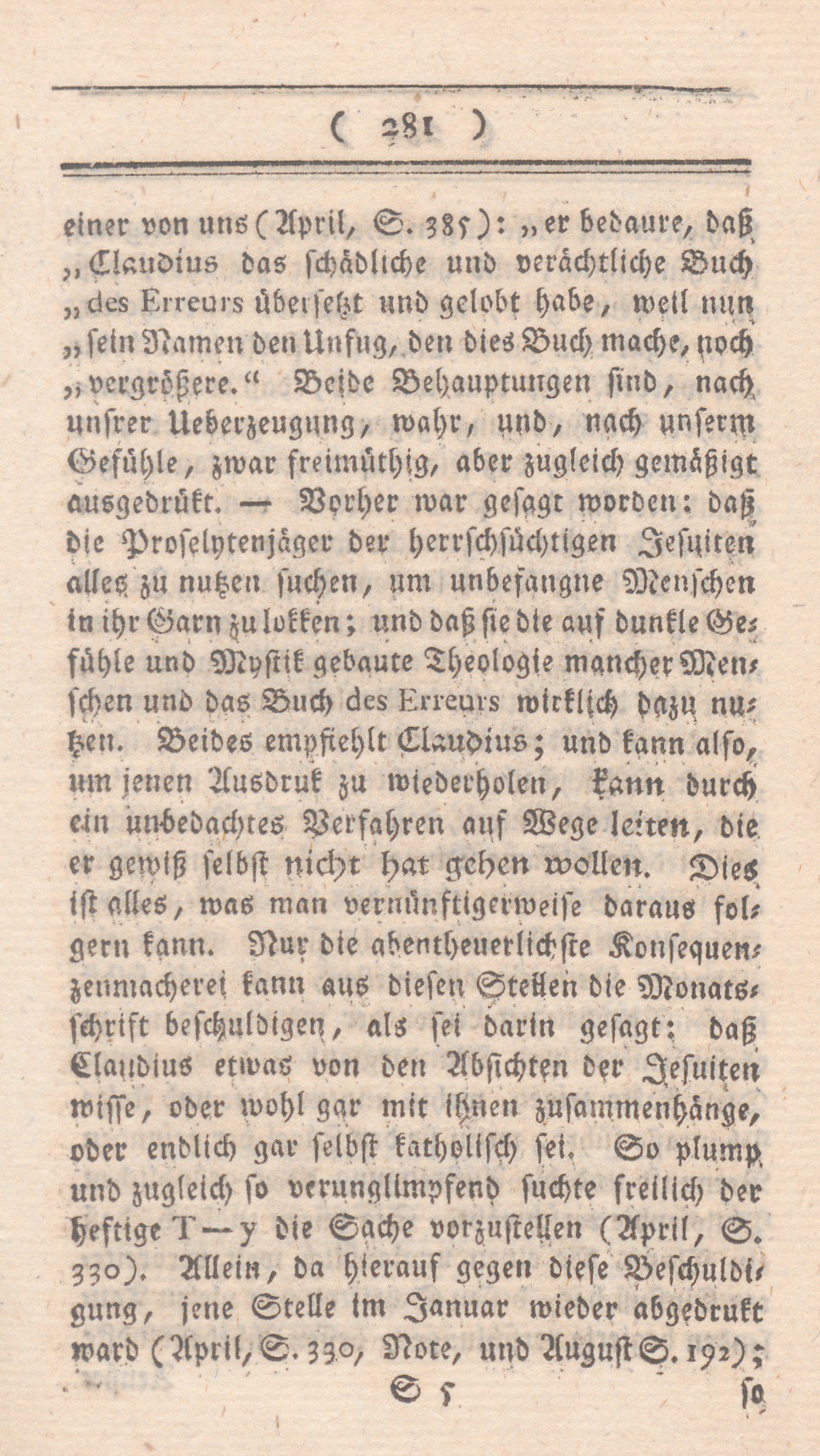 einer von uns (April, S. 385): „er bedaure, daß Claudius das schädliche und verächtliche Buch des Erreurs übersetzt und gelobt habe, weil nun sein Namen den Unfug, den dies Buch mache, noch vergrößere.“ Beide Behauptungen sind, nach unsrer Ueberzeugung, wahr, und, nach unserm Gefühle, zwar freimüthig, aber zugleich gemäßigt ausgedrükt. – Vorher war gesagt worden: daß die Proselytenjägerder herrschsüchtigen Jesuiten alles zu nutzen suchen, um unbefangene Menschen in ihr Garn zu lokken; und daß sie die auf dunkle Gefühle und Mystik gebaute Theologie mancher Menschen und das Buch des Erreurs wirklich dazu nutzen. Beides empfiehlt Claudius; und kann also, um jenen Ausdruk zu wiederholen, kann durch ein unbedachtes Verfahren auf Wege leiten, die er gewiß selbst nicht hat gehen wollen. Dies ist alles, was man vernünftigerweise daraus folgern kann. Nur die abentheuerlichste Konsequenzenmacherei kann aus diesen Stellen die Monatsschrift beschuldigen, als sei darin gesagt: daß Claudius etwas von den Absichten der Jesuiten wisse, oder wohl gar mit ihnen zusammenhänge, oder endlich gar selbst katholisch sei. So plump und zugleich so verunglimpfend suchte freilich der heftige T – Y die Sache vorzustellen (April, S. 330). Allein, da hierauf diese Beschuldigung, jene Stelle im Januar wieder abgedrukt war (April, S.330, Note, und August S. 192);