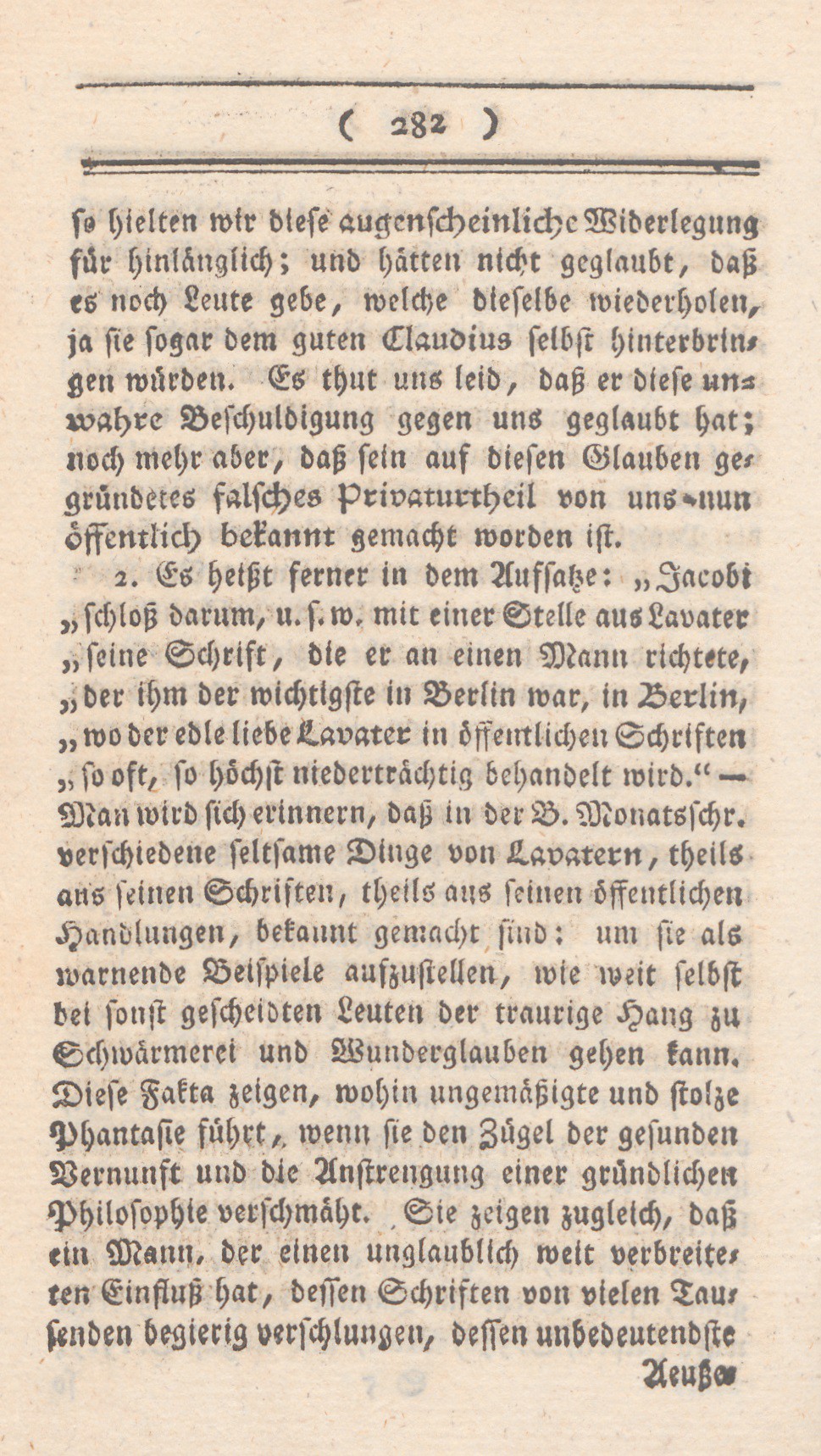 1. Es heißt ferner in dem Aufsatze: „Jacobi schloß darum, u.s.w. mit einer Stelle aus Lavater seine Schrift, die er an einen Mann richtete. der ihm der wichtigste in Berlin war, in Berlin, wo der edle liebe Lacvater in öffentlichen Schriften so oft, so höchst niederträchtig behandelt wird.“ – Man wird sich erinnern, daß in der B. Monatsschr. verschiedene seltsame Dinge von Lavatern, theils aus seinen Schriften, theils aus seinen öffentlichen Handlungen, bekannt gemacht sind: um sie als warnende Beispiele aufzustellen, wie weit selbst bei sonst gescheidten Leuten der traurige Hang zu Schwärmerei und Wunderglauben gehen kann. Diese Fakta zeigen, wohin ungemäßigte und stolze Phantasie führt, wenn sie den Zügel der gesunden Vernunft und die Anstrengung einer gründlichen Philosophie verschmäht. Sie zeigen zugleich, daß ein Mann, der einen unglaublich weit verbreiteteten Einfluß hat, dessen Schriften von vielen Tausenden begierig verschlungen, dessen unbedeutendste