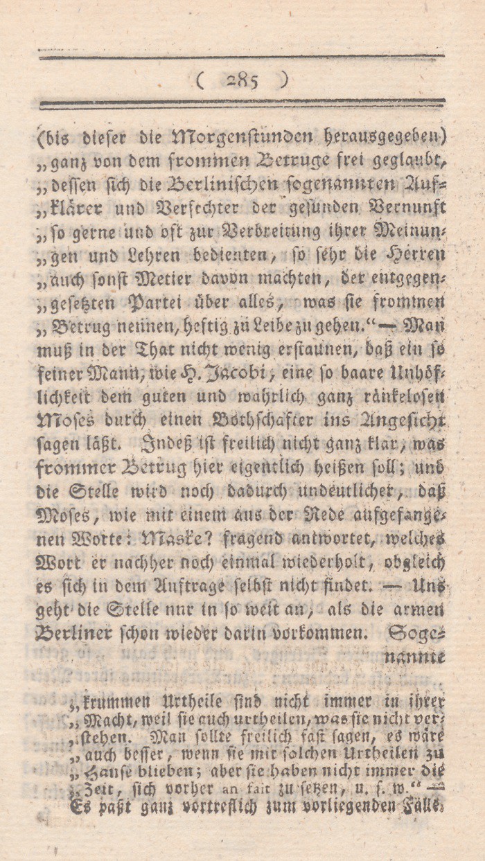 (bis dieser die Morgenstunden herausgegeben) „ganz von dem frommen Betruge frei geglaubt, dessen sich die Berlinischen sogenannten Aufklärer und Verfechter der gesunden Vernunft so gerne und oft zur Verbreitung ihrer Meinungen und Lehren bedienten, so sehr die Herren auch sonst Metier davon machten, derentgegengesetzten Partei über alles, was sie frommen Betrug nennen, heftig zu Leibe gehen.“ – Man muß in der That nicht wenig erstaunen, daß ein so feiner Mann, wie H. Jacobi, eine so baare Unhöflichkeit dem guten und wahrlich ränkelosen Moses durch einen Botschafter ins Angesicht sagen läßt. Indeß ist freilich nicht ganz klar, was frommer Betrug hier eigentlich heißen soll; und die Stelle wird noch dadurch undeutlicher, daß Moses, wie mit einem aus der Rede aufgefangenen Worte: Maske? fragend antwortet, welches Wort er nachher noch einmal wiederholt, obgleich es sich in dem Auftrage selbst nicht findet. – Uns geht die Stelle nur in so weit an, als die armen Berliner schon wieder darin vorkommen. Soge=