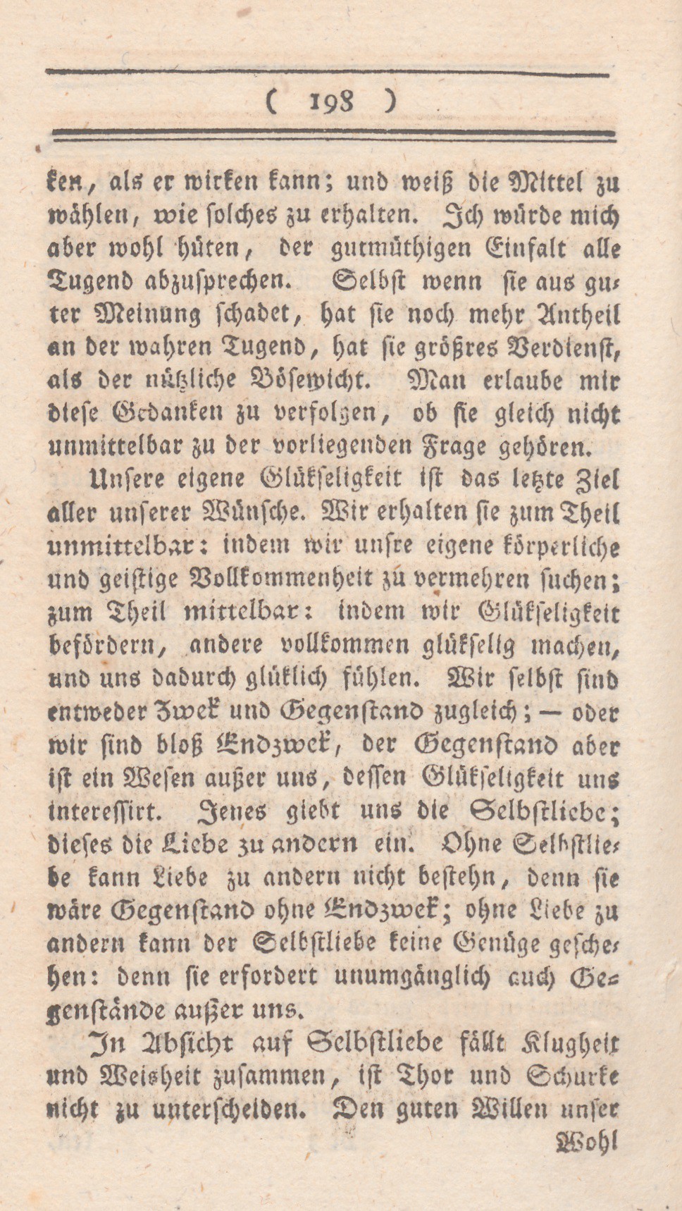 Unsere eigene Glükseligkeit ist das letzte Ziel aller unserer Wünsche. Wir erhalten sie zum Theil unmittelbar: indem wir unsere eigene körperliche und geistige Vollkommenheit zu vermehren suchen; zum Theil mittelbar: indem wir Glükseligkeit befördern, andere vollkommen glükselig machen, und uns dadurch glüklich fühlen. Wer selbst sind entweder Zwek und Gegenstand zugleich; – oder wir sind bloß Endzwek, der Gegenstand aber ist ein Wesen außer uns, dessen Glükseligkeit uns interessirt. Jenes giebt uns die Selbstliebe; dieses die Liebe zu andern ein. Ohne Selbstliebe kann Liebe zu andern nicht bestehn, denn sie wäre Gegenstand ohne Endzwek; ohne Liebe zu andern kann der Selbstliebe keine Genüge geschehen: denn sie erfordert unumgänglich auch Gegenstände außer uns.