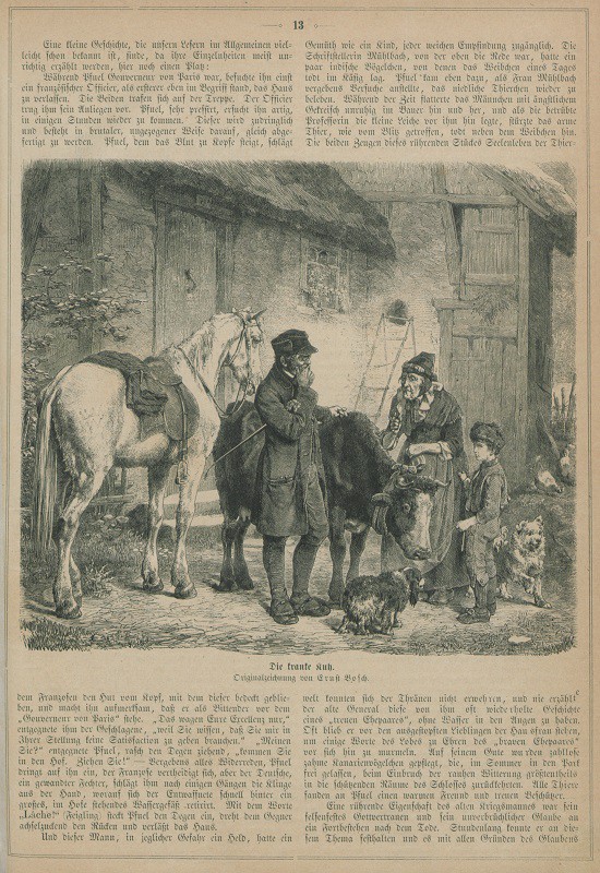 [16] Die kranke Kuh. (S. S. 13.) Dem Bauer gehört sein Vieh zur Familie; ein lahmer Gaul, eine Kuh, die „verschlagen“ hat, machen ihm oft nicht minder Sorge als die Krankheit von Weib oder Kind. Für unser Gefühl hat dies allerdings etwas Verletzendes; wenn wir uns aber veranschaulichen, wie eng die Existenz des Landmannes, sein tägliches Leben, sein Gedeihen und Emporkommen mit Wohl und Wehe seines Viehstandes verknüpft sind, so wird unser Urtheil sich mildern müssen; wir werden dann begreifen, wie ängstlich das alte Mütterchen auf unserm Bilde dem herbeigerufenen Curschmied und Thierarzte die Gebresten ihrer Kuh, wahrscheinlich ihrer einzigen, vorklagt; wie genau und haarklein sie alle Krankheitserscheinungen der Leidenden aufzählt, wie gespannt sie sammt ihrem Buben dem Ausspruche des dörflichen Heilkünstlers entgegenharrt, welcher – der Fall muß ein ernster sein – sich wohl zu bedenken scheint, ehe er sein Verdict abgibt.