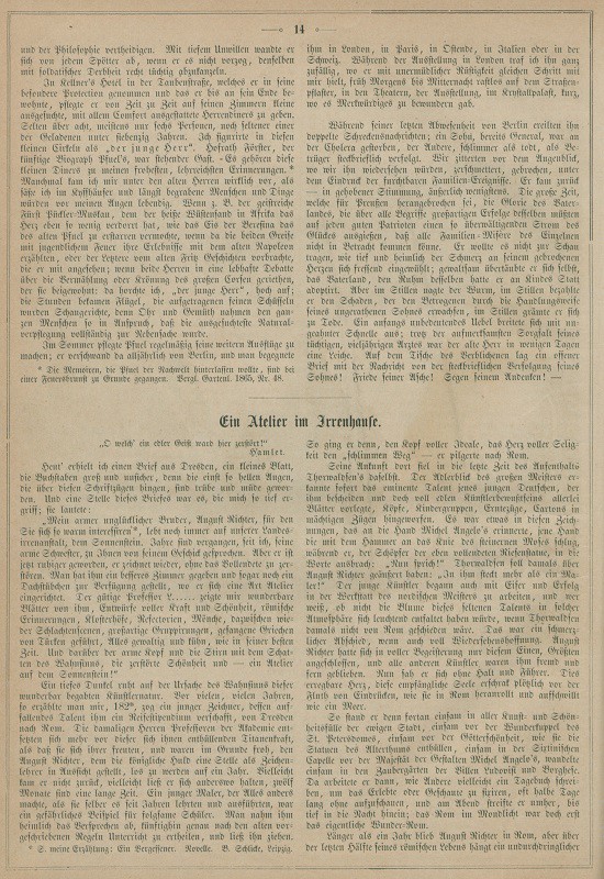„Mein armer unglücklicher Bruder, August Richter, für den Sie sich so warm interessiren[1], lebt noch immer auf unserer Landesirrenanstalt, dem Sonnenstein. Jahre sind vergangen, seit ich, seine arme Schwester, zu Ihnen von seinem Geschick gesprochen. Aber er ist jetzt ruhiger geworden, er zeichnet wieder, ohne das Vollendete zu zerstören. Man hat ihm ein besseres Zimmer gegeben und sogar noch ein Dachstübchen zur Verfügung gestellt, wo er sich eine Art Atelier eingerichtet. Der gütige Professor L … zeigte mir wunderbare Blätter von ihm, Entwürfe voller Kraft und Schönheit, römische Erinnerungen, Klosterhöfe, Refectorien, Mönche, dazwischen wieder Schlachtenscenen, großartige Gruppirungen, gefangene Griechen von Türken geführt, Alles gewaltig und kühn, wie in seiner besten Zeit. Und darüber der arme Kopf und die Stirn mit dem Schatten des Wahnsinns, die zerstörte Schönheit und – ein Atelier auf dem Sonnenstein!“