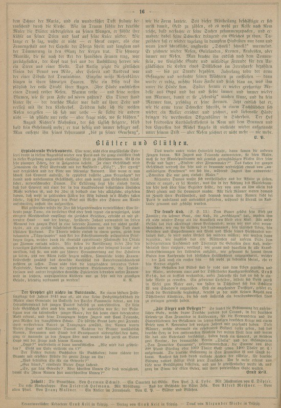 Der Prophet gilt nichts im Vaterlande. An einem schönen Frühlingstage des Jahres 1843 war es, als eine kleine Hochzeitsgesellschaft die Mairie einer Gemeinde im Umkreise der Pariser Bannmeile betrat, um den Heirathscontract des jungen Paares daselbst zu unterschreiben. So klein diese Gesellschaft aber auch sein mochte, so auserlesen war sie; der Bräutigam war ein talentvoller junger Maler, der sich heute eines bedeutenden Rufs erfreut, und seine Trauzeugen hießen Ingres und Paul Delaroche, zwei Meister der französischen Schule. Die hübsche Braut hatte zwei Freunde ihres verstorbenen Vaters zu Trauzeugen gewählt, ihre Namen waren Victor Hugo und Alexander Dumas. Nachdem der Beamte umständlich Namen, Vornamen und Stand des Brautpaares niedergeschrieben hatte, ging er nunmehr zu den Zeugen über und wendete sich zuerst an Victor Hugo mit der Frage nach seinem Namen.