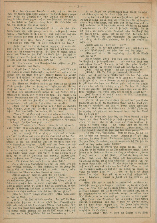 Während dieser Worte hatte er eine Stalllaterne von der Wand heruntergerissen, angezündet und war scheltend den Hausgang entlang dahin gerannt; kopfschüttelnd sah ihm die Hauserin nach und öffnete die hintere Küchenthür. „Alte grantige Zuwider-Wurz!“ murmelte sie, „bis er den Umweg um’s Haus macht, bin ich dreimal im Stall und das ganze Unglück ist wieder gehoben …“ (Fortsetzung folgt)