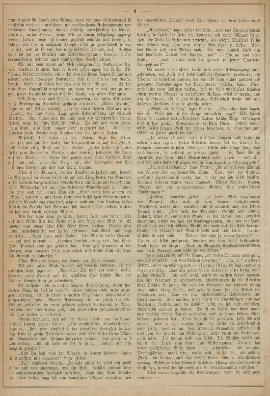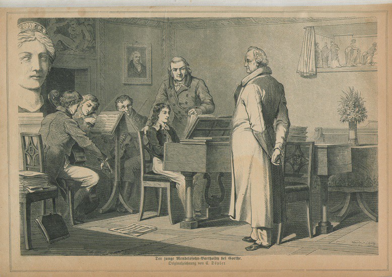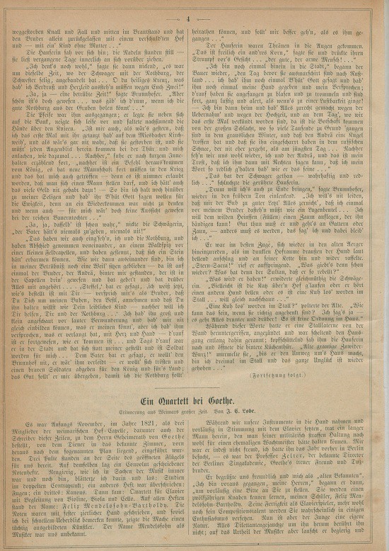Es war Anfangs November, im Jahre 1821, als drei Mitglieder der weimarischen Hof-Capelle, darunter auch der Schreiber dieser Zeilen, zu dem Herrn Geheimerath von Goethe bestellt, von dem Diener in das bekannte Zimmer, vorn heraus nach dem sogenannten Plan liegend, eingeführt wurden. Drei Pulte standen an der Seite des geöffneten Flügels für uns bereit. Auf demselben lag ein Convolut geschriebener Notenhefte. Neugierig, wie ich in Sachen der Musik immer war und noch bin, blätterte ich darin und las: Studien im doppelten Contrapunkt; ein anderes Heft war überschrieben: Fugen; ein drittes: Kanons. Dann kam: Quartett für Clavier mit Begleitung von Violine, Viola und Cello. Auf allen Heften stand der Name: Felix Mendelssohn-Bartholdy. Die Noten waren mit fester zierlicher Hand geschrieben, und soviel ich bei schnellem Ueberblick bemerken konnte, zeigte die Mache einen tüchtig ausgebildeten Künstler. Der Name Mendelssohn als Musiker war uns unbekannt.