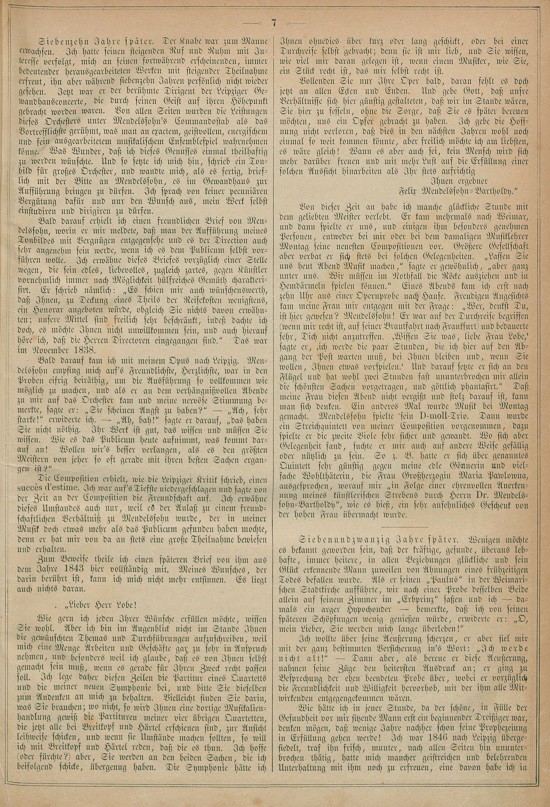 Er begrüßte uns freundlich und mich als „alten Bekannten“. „Ich bin voraus gegangen, meine Herren,“ begann er dann, „um vorläufig eine Bitte an Sie zu stellen. Sie werden einen zwölfjährigen Knaben kennen lernen, meinen Schüler, Felix Mendelssohn-Bartholdy. Seine Fertigkeit als Clavierspieler, mehr wohl noch sein Compositionstalent werden Sie wahrscheinlich in einigen Enthusiasmus versetzen. Nun ist aber der Junge eine eigene Natur. Alles Dilettantengejauchze um ihn herum berührt ihn nicht; auf das Urtheil der Musiker aber lauscht er begierig und ...