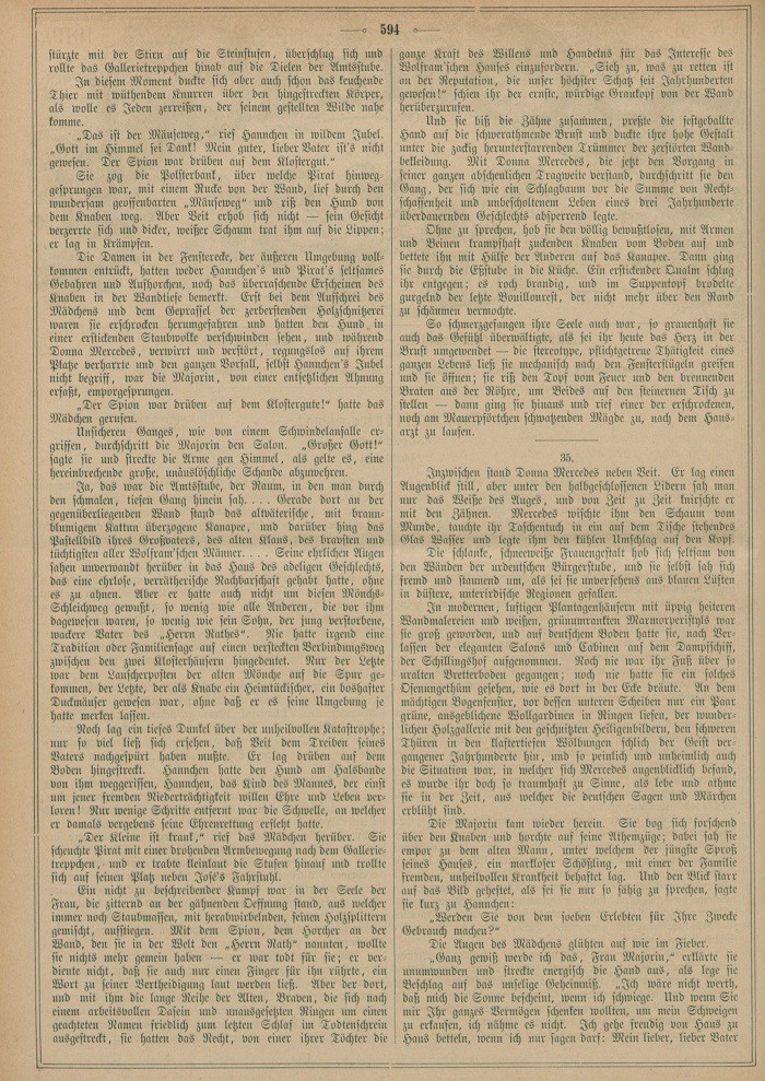 Die Damen in der Fensterecke, der äußeren Umgebung vollkommen entrückt, hatten weder Hannchen’s und Pirat’s seltsames Gebahren und Aufhorchen, noch das überraschende Erscheinen des Knaben in der Wandtiefe bemerkt. Erst bei dem Aufschrei des Mädchens und dem Geprassel der zerberstenden Holzschnitzerei waren sie erschrocken herumgefahren und hatten den Hund in einer erstickenden Staubwolke verschwinden sehen, und während Donna Mercedes, verwirrt und verstört, regungslos auf ihrem Platze verharrte und den ganzen Vorfall, selbst Hannchen’s Jubel nicht begriff, war die Majorin, von einer entsetzliche Ahnung erfaßt, emporgesprungen.