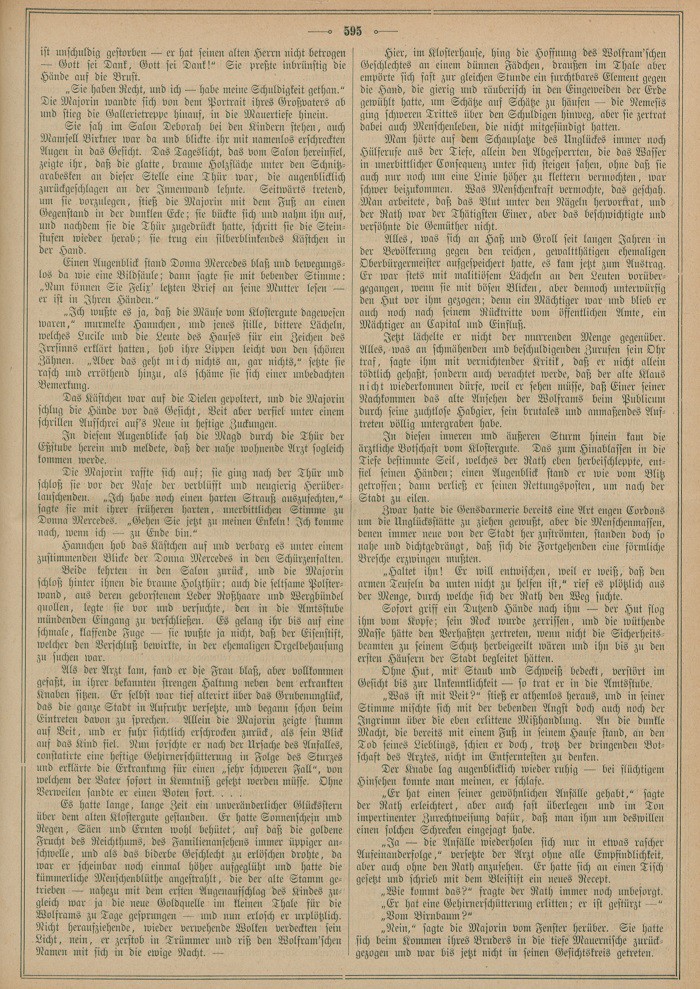 Es hatte lange, lange Zeit ein unveränderlicher Glücksstern über dem alten Klostergute gestanden. Er hatte Sonnenschein und Regen, Säen und Ernten wohl behütet, auf daß die goldene Frucht des Reichthums, des Familienansehens immer üppiger anschwelle, und als das biderbe Geschlecht zu erlöschen drohte, da war er scheinbar noch einmal höher aufgeglüht und hatte die kümmerliche Menschenblüthe angestrahlt, die der alte Stamm getrieben – nahezu mit dem ersten Augenaufschlag des Kindes zugleich war ja die neue Goldquelle im kleinen Thale für die Wolframs zu Tage gesprungen – und nun erlosch er urplötzlich. Nicht heraufziehende, wieder verwehende Wolken verdeckten sein Licht, nein, er zerstob in Trümmer und riß den Wolfram’schen Namen mit sich in die ewige Nacht. –