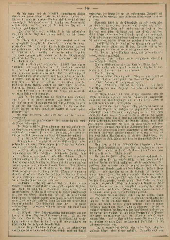 So schmerzgefangen ihre Seele auch war, so grauenhaft sie auch das Gefühl überwältigte, als sei ihr heute das Herz in der Brust umgewendet – die stereotype, pflichtgetreue Thätigkeit eines ganzen Lebens ließ sie mechanisch nach den Fensterflügeln greifen und sie öffnen; sie riß den Topf vom Feuer und den brennenden Braten aus der Röhre, um Beides auf den steinernen Tisch zu stellen – dann ging sie hinaus und rief einer der erschrockenen, noch am Mauerpförtchen schwatzenden Mägde zu, nach dem Hausarzt zu laufen.