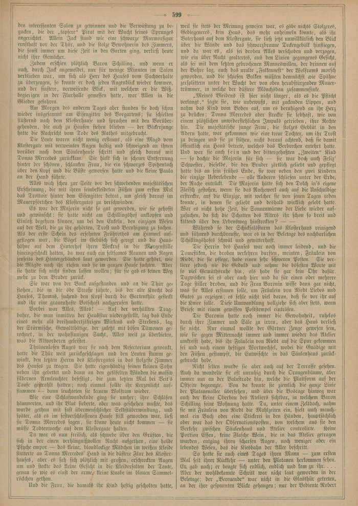 In modernen, luftigen Plantagenhäusern mit üppig heiteren Wandmalereien und weißen, grünumrankten Marmorperistyls war sie groß geworden, und auf deutschem Boden hatte sie, nach Verlassen der eleganten Salons und Cabinen auf dem Dampfschiff, der Schillingshof aufgenommen. Noch nie war ihr Fuß über so uralten Bretterboden gegangen; noch nie hatte sie ein solches Ofenungethüm gesehen, wie es dort in der Ecke dräute. An dem mächtigen Bogenfenster, vor dessen unteren Scheiben nur ein Paar grüne, ausgeblichene Wollgardinen in Ringen liefen, der wunderlichen Holzgallerie mit den geschnitzten Heiligenbildern, den schweren Thüren in den klaftertiefen Wölbungen schlich der Geist vergangener Jahrhunderte hin, und so peinlich und unheimlich auch die Situation war, in welcher sich Mercedes augenblicklich befand, es wurde ihr doch so traumhaft zu Sinne, als lebe und athme sie in der Zeit, aus welcher die deutschen Sagen und Märchen erblüht sind.