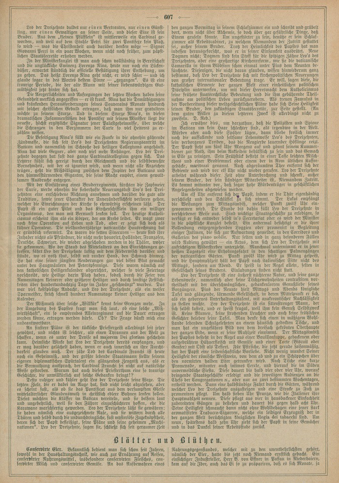 Desto ruhiger und kühler geht Leo der Dreizehnte seine Wege. Die letzten Ziele, die er dabei im Auge hat, sind nicht leicht abzusehen, aber es scheint fast, als ob sie das Pontificat aus dem versumpften Gleise mittelalterlicher Glaubenswuth in christlich edlere Bahnen lenken sollen. Dieses möchten die Kläffer im Vatican vereiteln, und sie belfern laut und ungeberdig, weil sie den Führer einzuschüchtern hoffen, ehe die Karawane marschfertig geworden. Leo der Dreizehnte läßt sie gewähren; sie haben nämlich eine ausgezeichnete Nase, und sie wittern durch alle Thüren und selbst durch die undurchdringliche, fast mysteriöse Zugeknöpftheit, deren sich der Papst befleißigt, seine Pläne und seine geheime „Machinationen“. Leo der Dreizehnte, sagen sie, schließt sich seit geraumer Zeit den ganzen Vormittag in seinem Schlafzimmer ein und schreibt und grübelt dort, wenn nicht über Alchemie, so doch über gar gefährliche Dinge, daß Einem gruseln könnte. Um ungestörter zu sein, benütze er sein Schlafzimmer als Arbeitscabinet, zu welchem Niemandem der Zutritt gestattet ist außer seinem Bruder. Trotz der Heimlichkeit des Papstes hat man indessen herausgeforscht, was er in seiner Einsamkeit ausbrütet. Neue Dogmen nicht; Dogmen sind kein Stoff für die spitzigen Zähne Leo’s des Dreizehnten, aber eine großartige Kirchenreform, wie sie die vaticanische Camarilla in ihrem Blödsinn schon einmal unter Pius dem Neunten befürchtete. Diejenigen, die nicht daran glauben, wissen hinwiederum ganz bestimmt, daß Leo der Dreizehnte sich mit kirchenpolitischen Neuerungen von großer internationaler Bedeutung trage. Er will, sagen diese, die katholischen Elemente der ganzen Welt einer einheitlichen politischen Disciplin unterwerfen, um mit dieser Heeresmacht dem Katholizismus seine frühere staatsrechtliche Bedeutung und die ihm gebührende Theilnahme am politischen Leben zurückzuerobern. Als treuen Famulus in der Verbreitung dieser weltgeschichtlichen Pläne habe sich Seine Heiligkeit seinen Bruder, den zukünftigen Staatssecretär, zur Seite gestellt. (An dem guten Willen zu diesem letzteren Zweck ist allerdings nicht zu zweifeln. D. Red.)