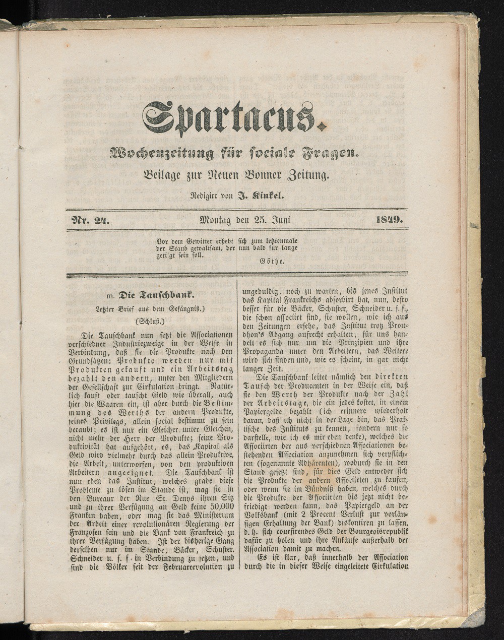 Spartacus, Sonntagsbeilage der Neuen Bonner Zeitung 25.Juni 1849 Nr. 24 Seite 1 bis 4