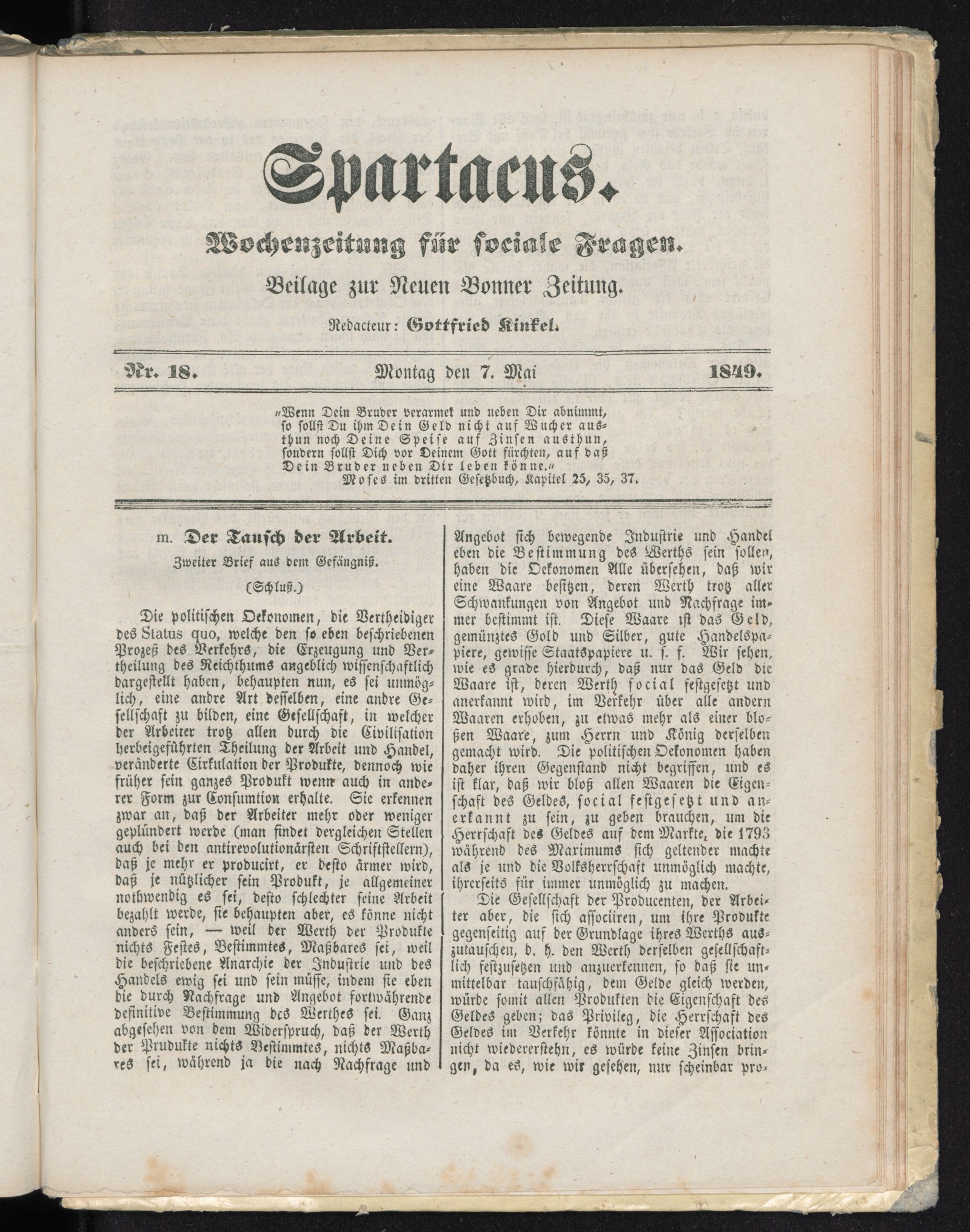 Spartacus, Sonntagsbeilage der Neuen Bonner Zeitung 7. Mai 1849 Nr. 18 Seite 1 bis 4