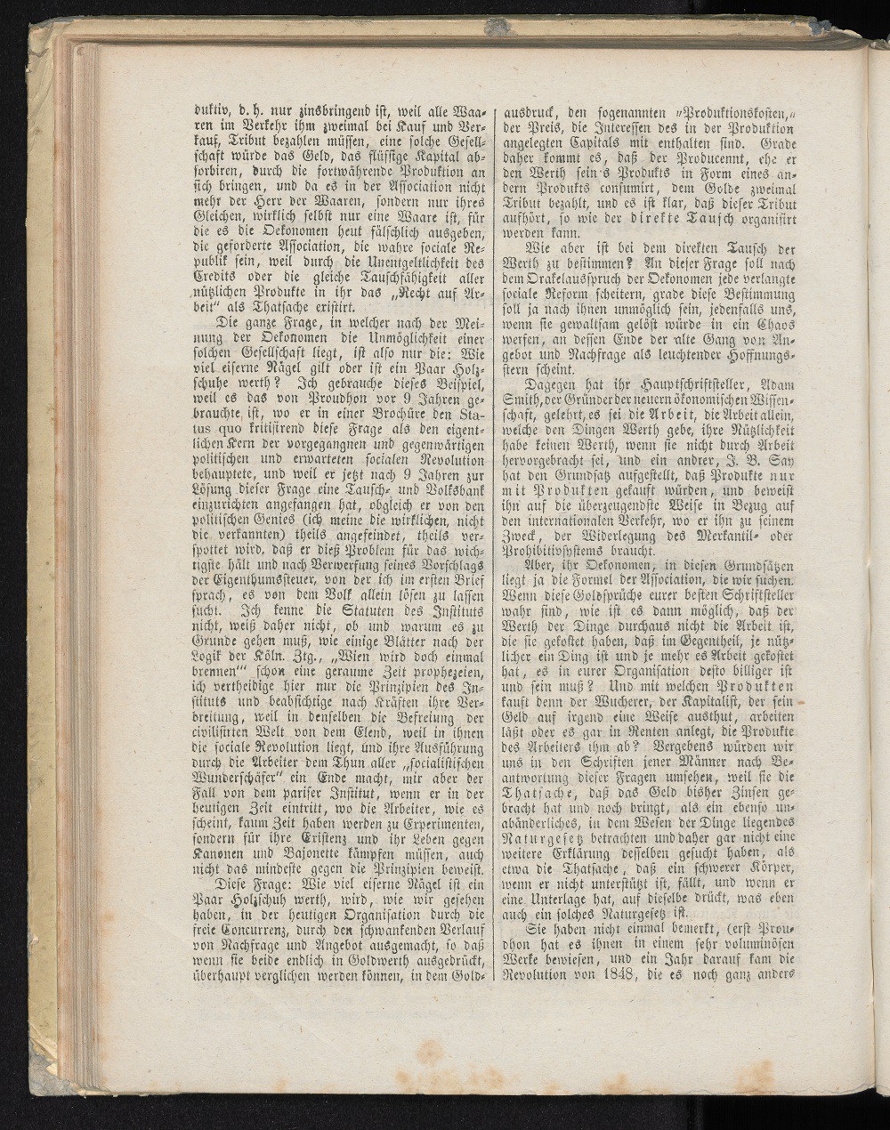 Die ganze Frage, in welcher nach der Meinung der Oekonomen die Unmöglichkeit einer solchen Gesellschaft liegt, ist also nur die: Wie viel eiserne Nägel gilt oder ist ein Paar Holzschuhe werth? Ich gebrauche dieses Beispiel, weil es das von Proudhan vor 9 Jahren gebrauchte ist, wo er in einer Broschüre den Status quo kritisirend diese Frage als den eigentlichen Kern der vorgegangenen und gegenwärtigen politischen und erwarteten socialen Revolution behauptete, und weil er jetzt nach 9 Jahren zur Lösung dieser Frage eine Tausch- und Volksbank einzurichten angefangen hat, obgleich er von den politischen Genies (ich meine die wirklichen, nicht die verkannten) theils angefeindet, theils verspottet wird, daß er dieß Problem für das wichtigste hält und nach Verwerfung seines Vorschlags der Eigenthumssteuer, von der ich im ersten Brief sprach, es von dem Volk allein lösen zu lassen sucht. Ich kenne die Statuten des Instituts nicht, weiß daher nicht, ob und warum es zu Grunde gehen muß, wie einige Blätter nach der Logik der Köln. Ztg. „Wien wird doch einmal brennen“ schon eine geraume Zeit prophezeien, ich vertheidige hier nur die Prinzipien des Instituts und beabsichtige nach Kräften ihre Verbreitung, weil in derselben die Befreiung der zivilisirten Welt von dem Elend, weil in ihnen die sociale Revolution liegt, und die Ausführung durch die Arbeiter dem Thun aller „socialistischen Wunderschäfer“ ein Ende macht, mir aber der Fall von dem Pariser Institut, wenn er in der heutigen Zeit eintritt, wo die Arbeiter, wie es scheint, kaum Zeit haben werden zu Experimenten, sondern für ihre Existenz und ihr Leben gegen Kanonen und Bajonette kämpfen müssen, auch nicht das mindeste gegen die Prinzipien beweist.